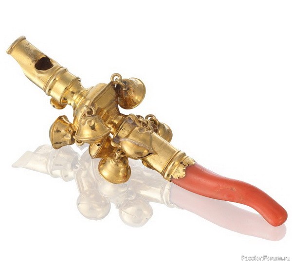 Голландская позолоченная погремушка-свисток с ручкой из коралла, высота 13 см, около 1825 г.