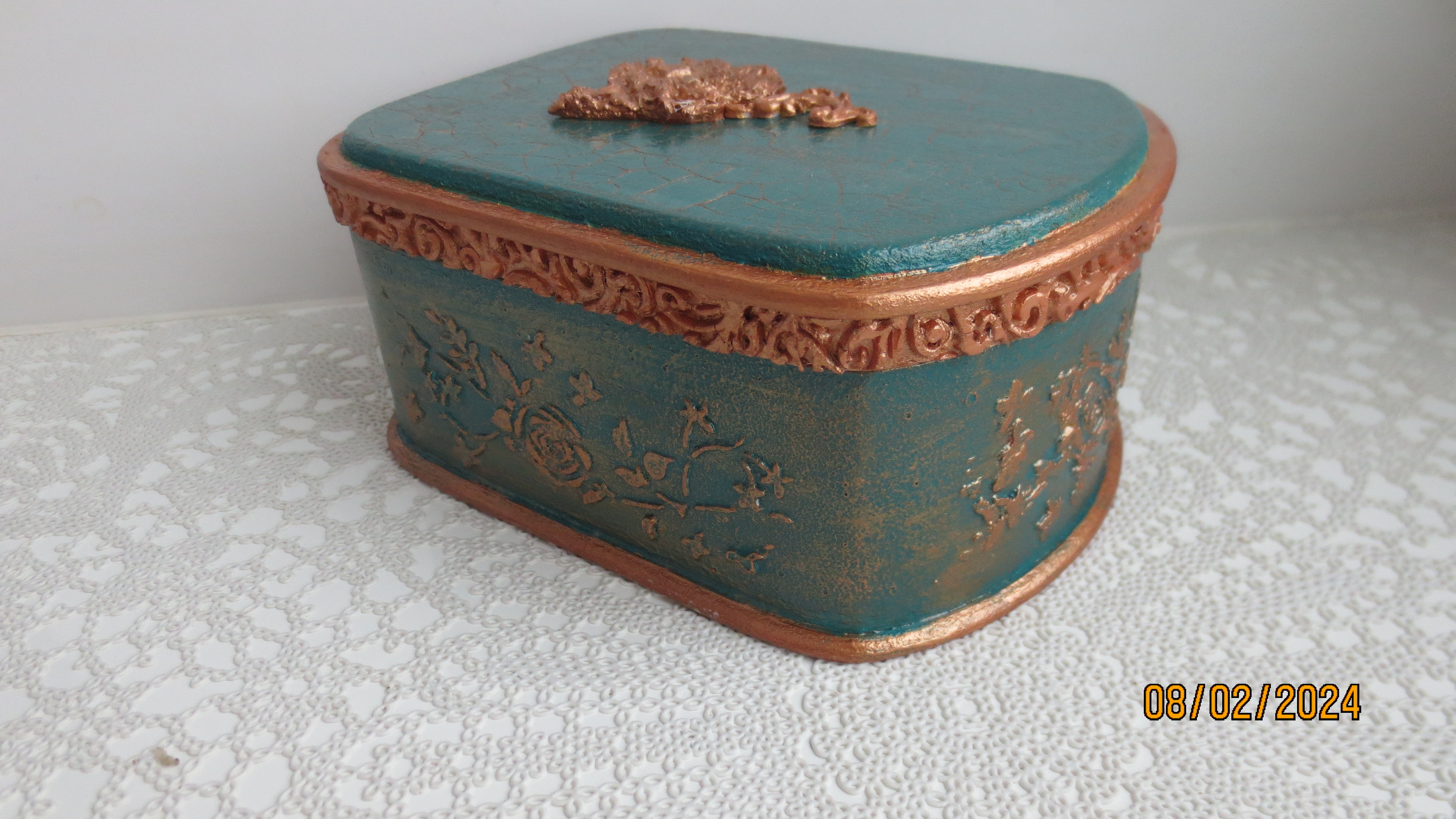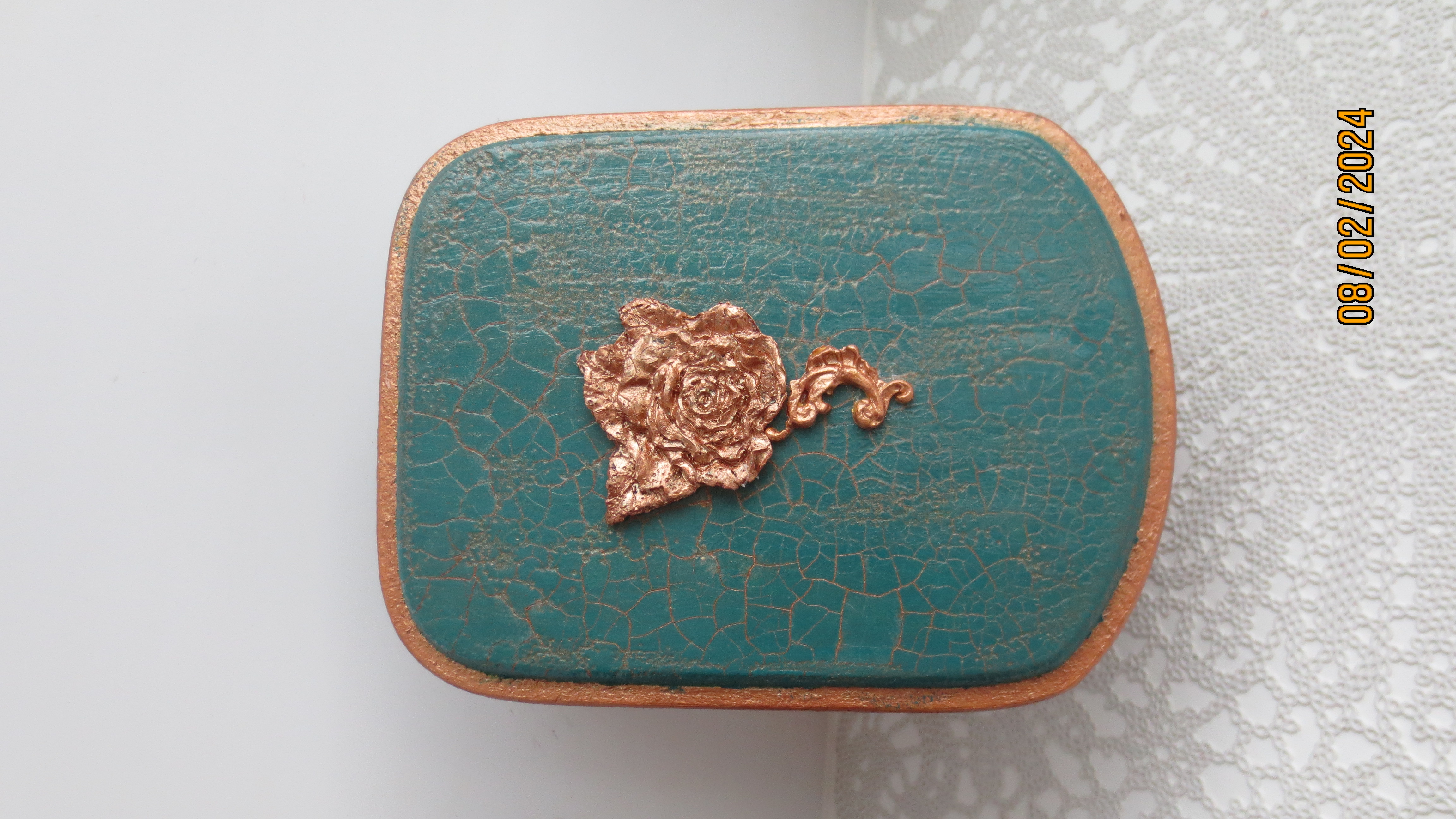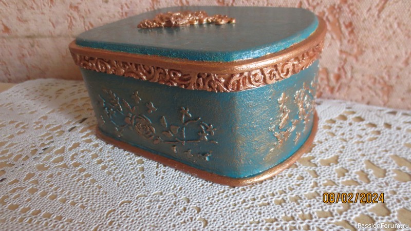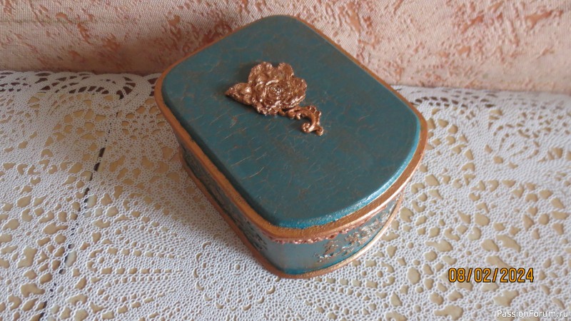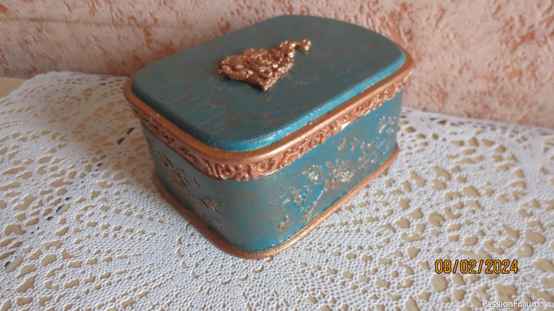 Мне тоже нравятся шкатулочки-малышки.И мы эти шкатулки закупаем у одного мастера с Ириной.Только я их декорирую по-другому,не цветами.Вот посмотрите,что получилось у меня.Шкатулки из МДФ.Использовала акриловые краски и бронзовый металлик,отливки из молдов,коврик для отливок,шёлк для отделки внутри шкатулки,двухшаговый кракелюр(уж больно он мне нравится),трафареты,шпаклёвка.Лак декупажный обязательно.