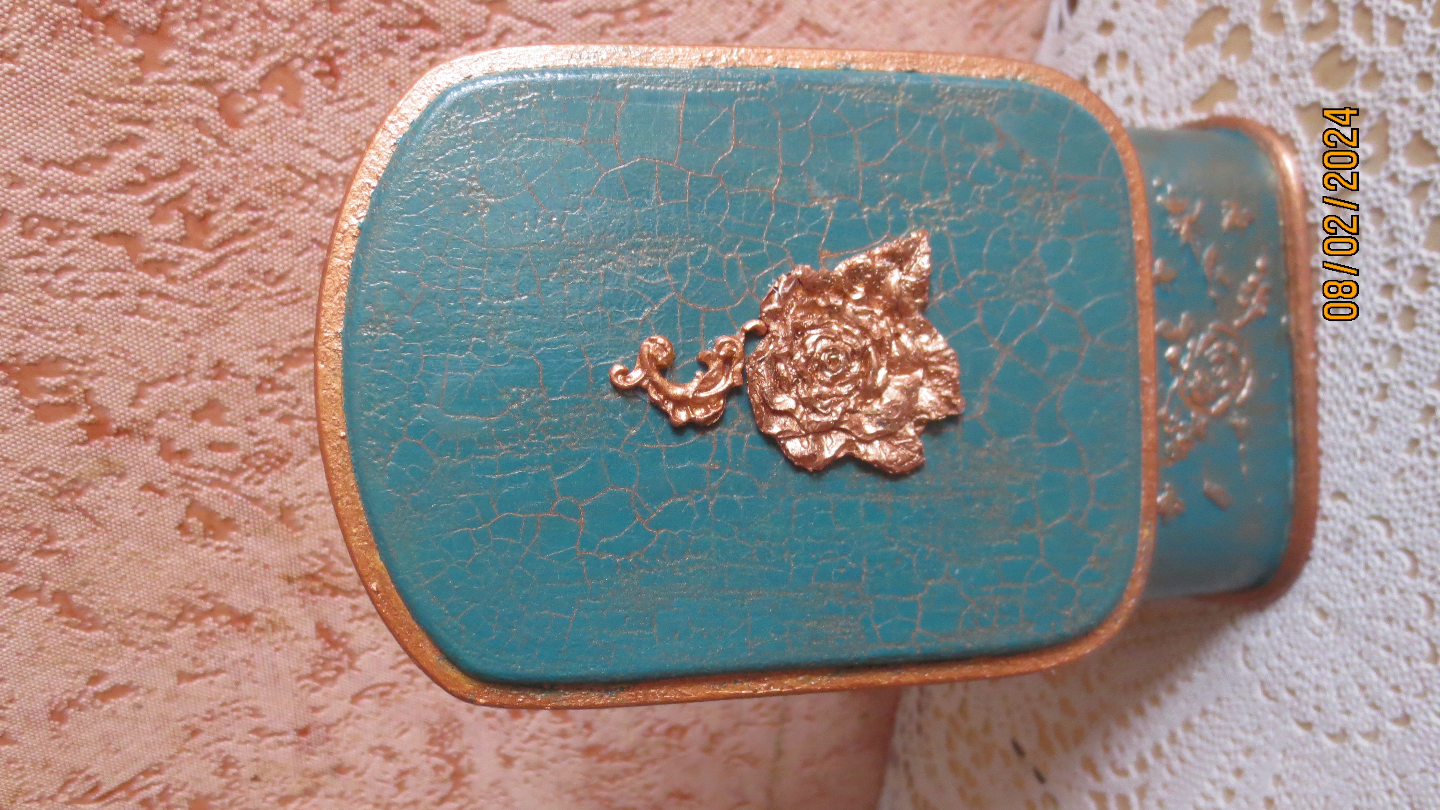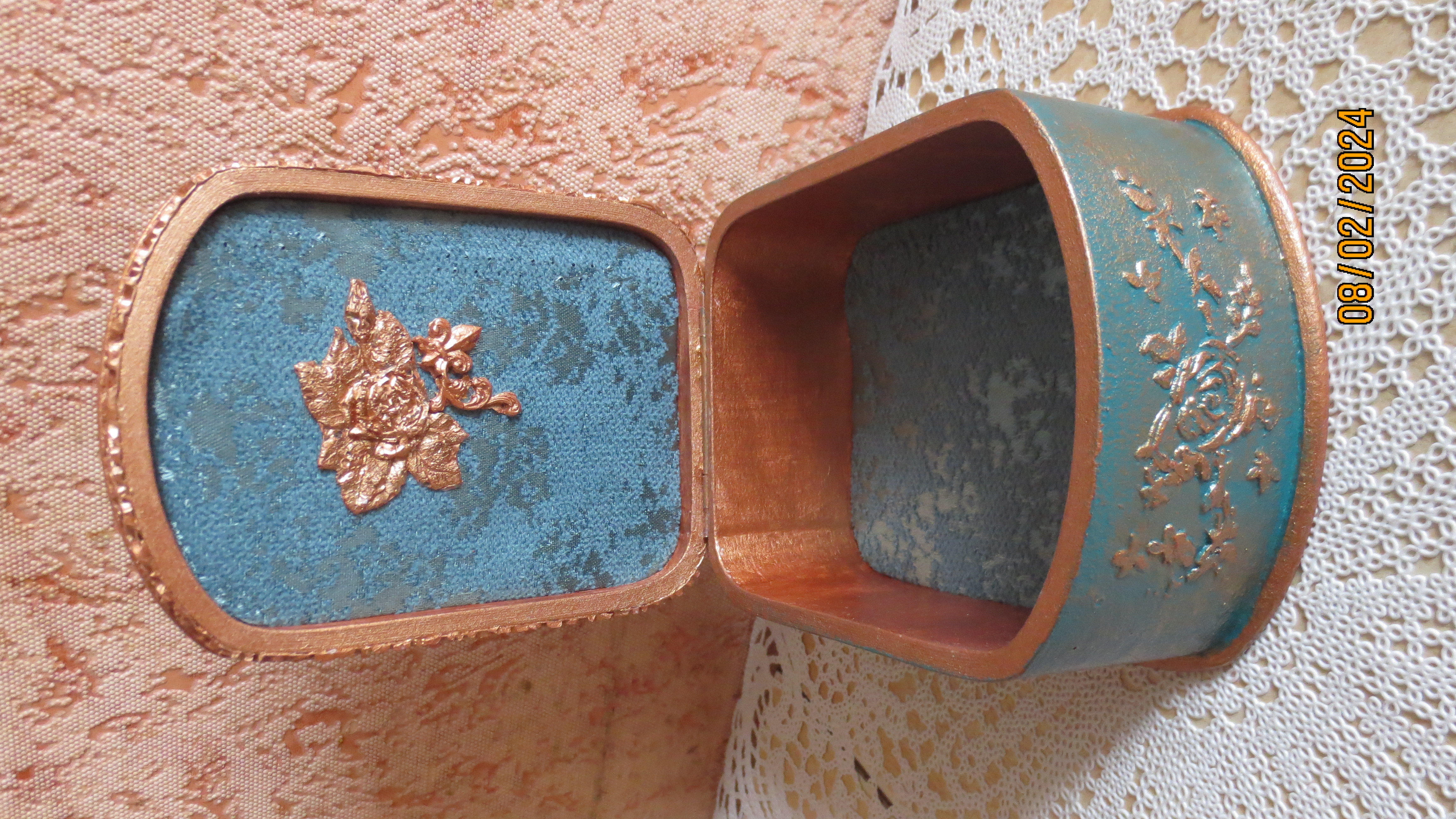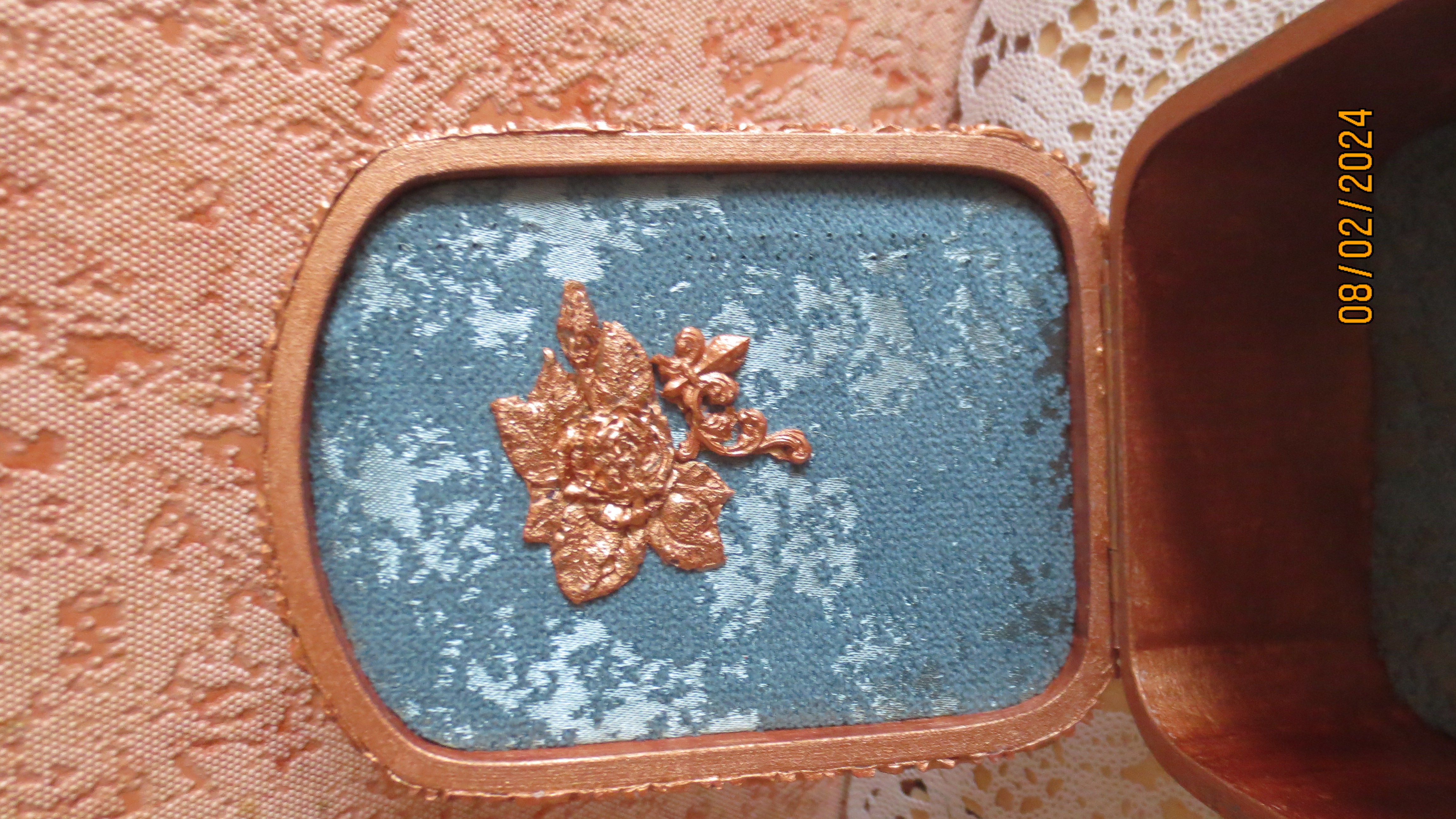 Мне тоже нравятся шкатулочки-малышки.И мы эти шкатулки закупаем у одного мастера с Ириной.Только я их декорирую по-другому,не цветами.Вот посмотрите,что получилось у меня.Шкатулки из МДФ.Использовала акриловые краски и бронзовый металлик,отливки из молдов,коврик для отливок,шёлк для отделки внутри шкатулки,двухшаговый кракелюр(уж больно он мне нравится),трафареты,шпаклёвка.Лак декупажный обязательно.