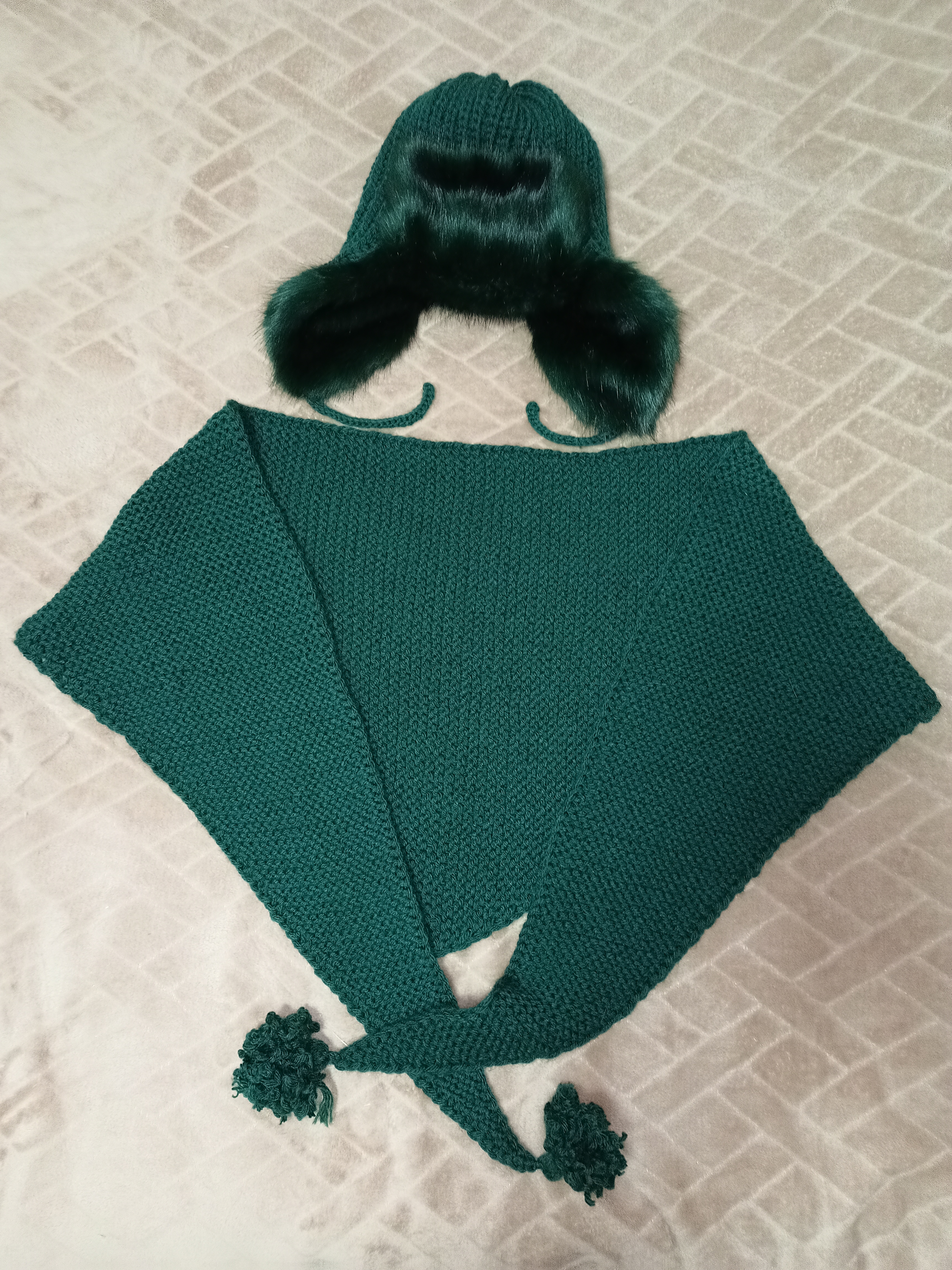 Красивый комплект. На концах бактуса тоже можно было меховые помпончики сделать, но и так тоже замечательно. Красивый цвет комплекта.