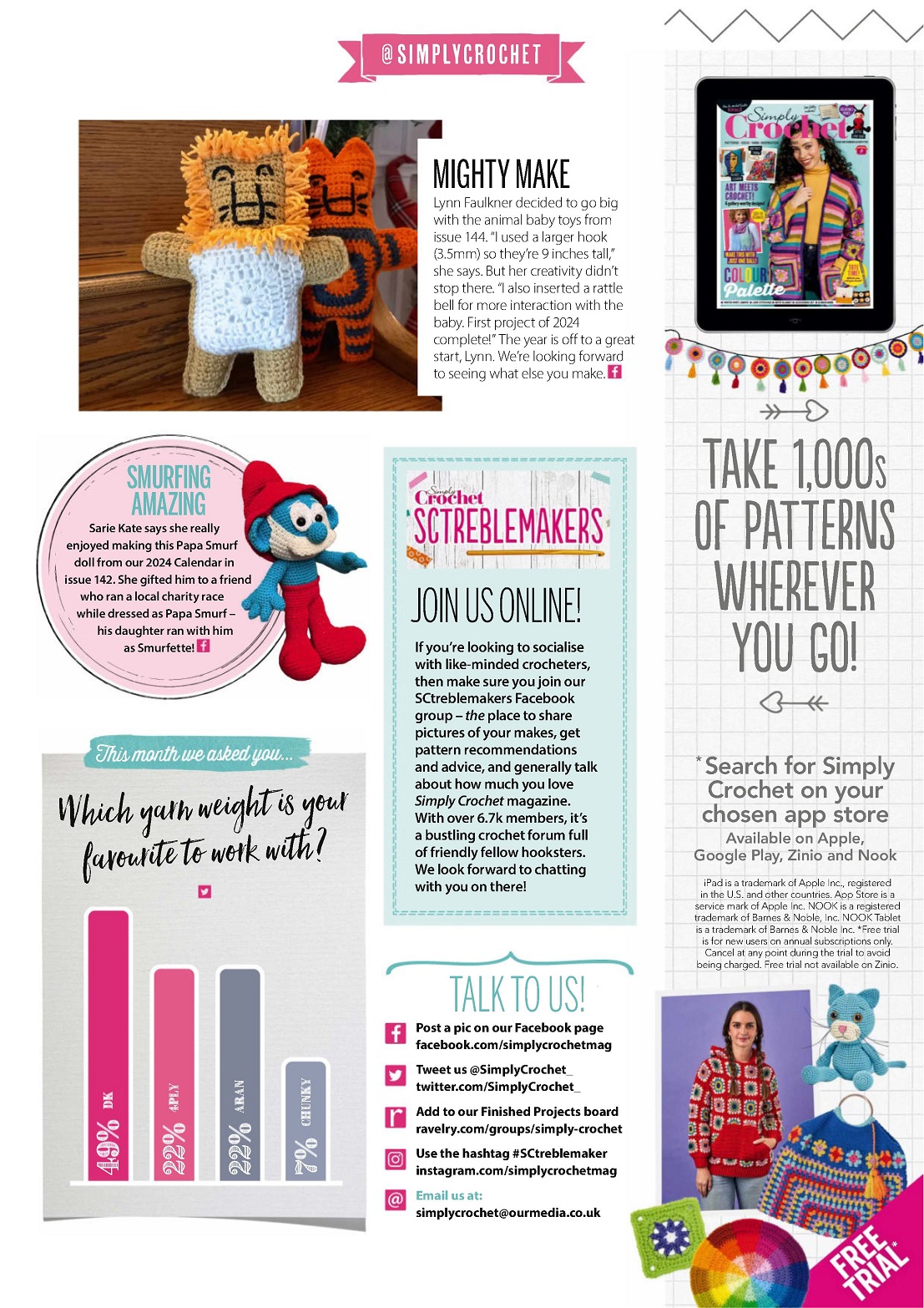 Журнал "Simply Crochet" посвящён вязанию крючком. В каждом выпуске этого журнала представлены проекты для вязания моделей одежды для взрослых и детей, аксессуаров, игрушек, предметов интерьера для дома.