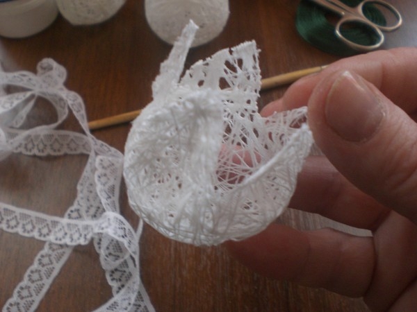 5. Разрежьте кокон так, чтобы получилась звёздочка. Все лепесточки отогните наружу. Лепестки по краям обклейте кружевом.