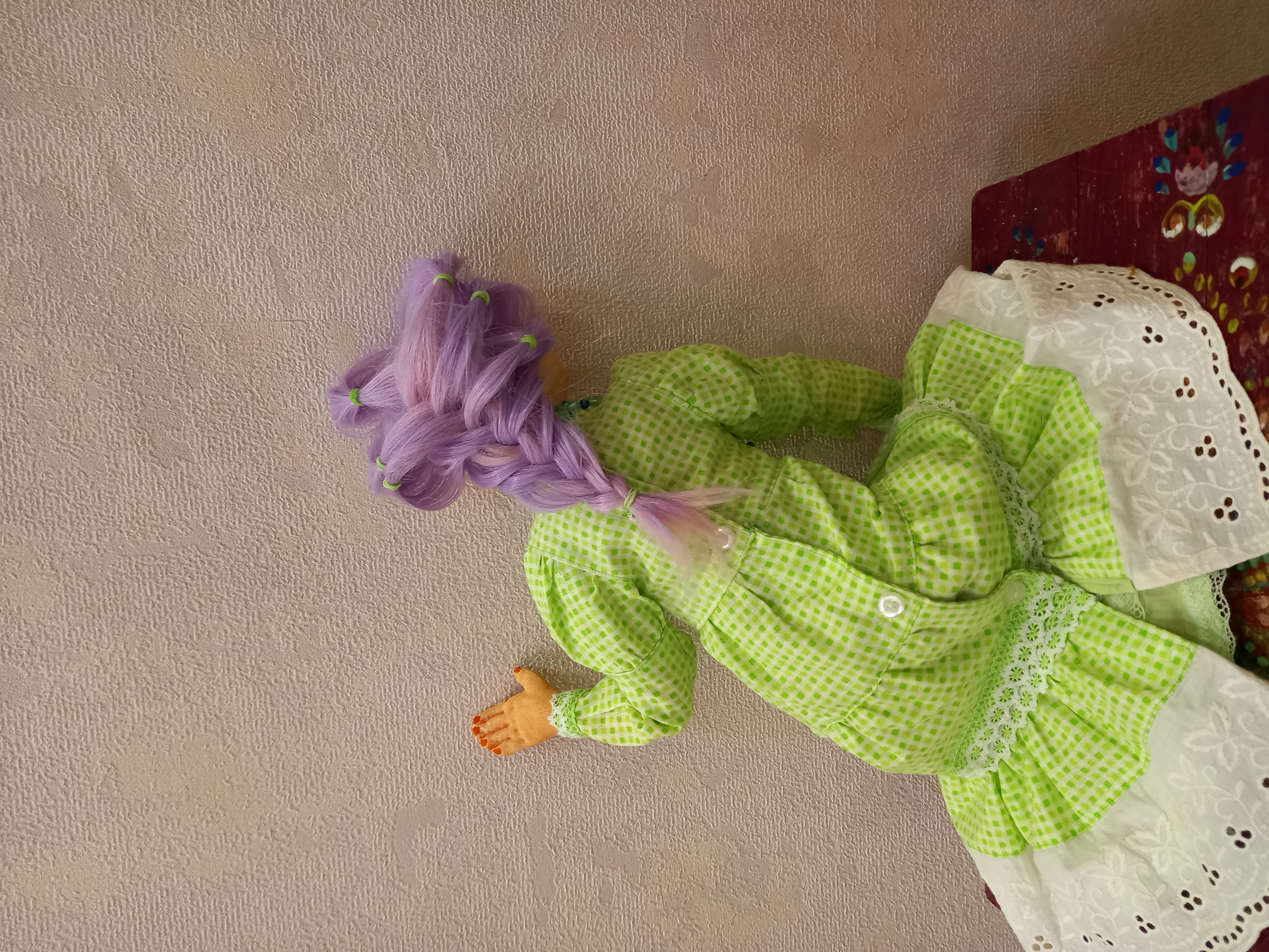 Галя, какая удивительная получилась куколка. Фартук ей, коненчо, не нужен, зачем это — фартук. А вот жилеточка, бусики, кружева- совсем другое дело. Волосы немного необычны, но ей явно нравятся, значит все хорошо!