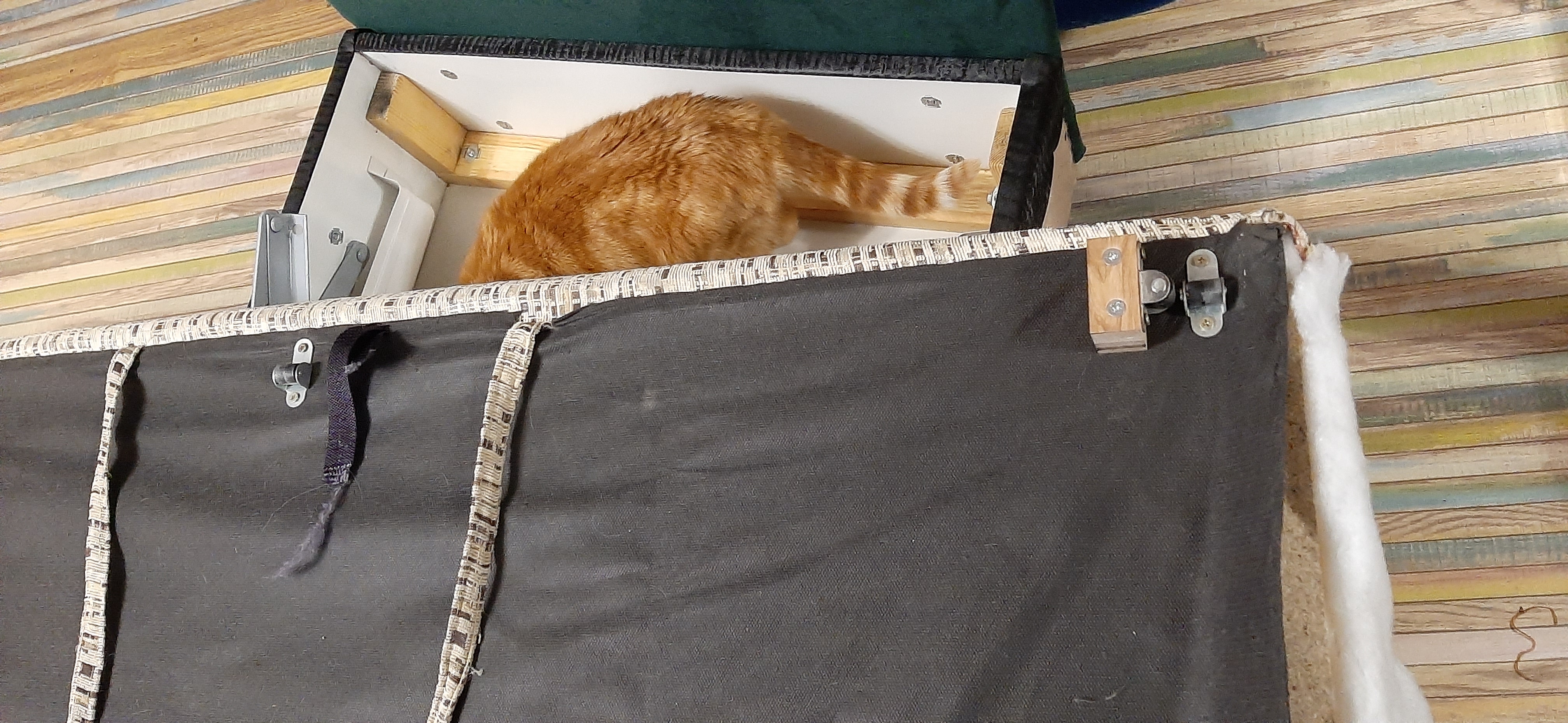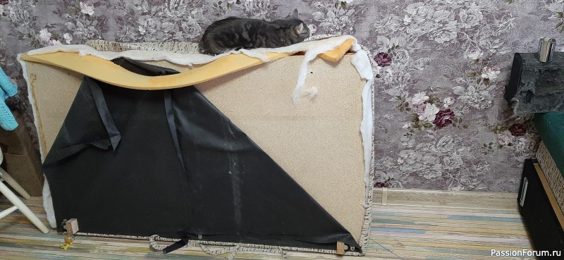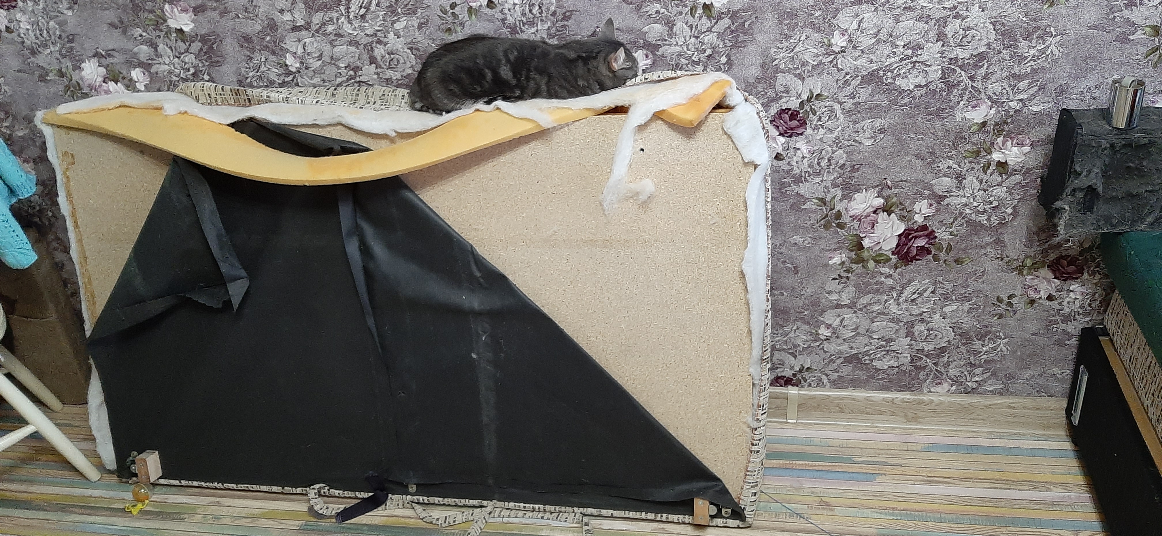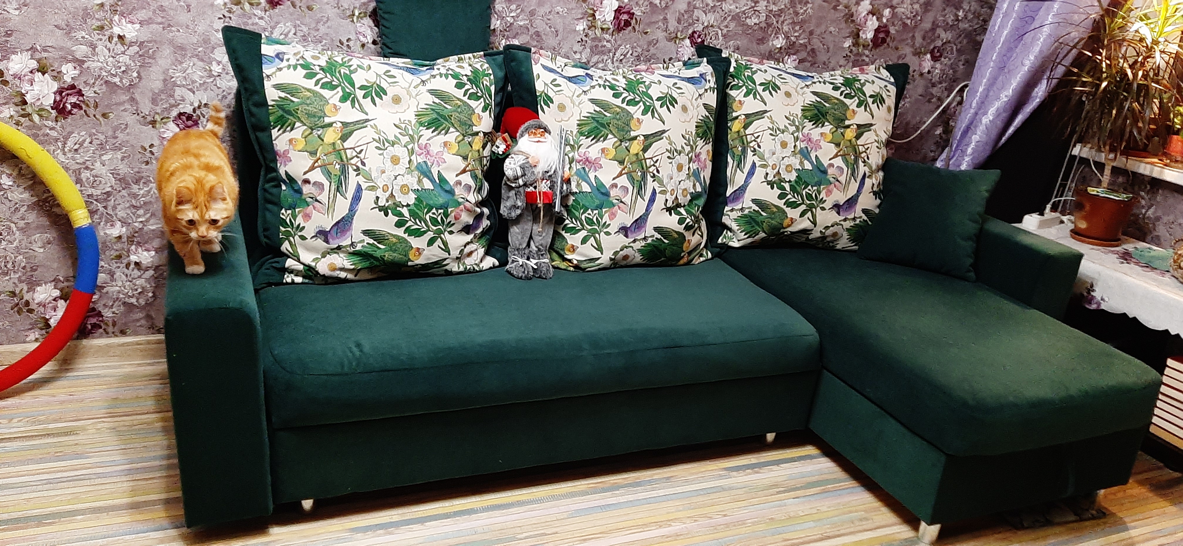 Добрый день , дорогие рукодельницы! Осенью я занималась перетяжкой своего старого дивана и хочу вам показать, что из этого получилось). Покупать новый диван я не планировала, т к купила перед этим кровать из Асконы и теперь диван использовался только для редкого просмотра телевизора, да и моя кошачья мафия в количестве 4 особей этому не способствовала))). На Вайлберисе я заказала мебельный велюр ( взяла с запасом ) и поролон, т к один участок был сильно продавлен. Мы с мужем разобрали диван на составляющие))) и я занялась работой! Особо фото рабочего процесса не делала, т к просто не думала фотографировать, сделала фотки для того, что б мне поверили..))). По очереди снимала старую обшивку, по ней кроила и шила новую, также пришивая синтепон, если он был, и одевала на " запчасти" ))), потом закрепляла мебельным степлером. Сняв старый поролон, новый я приклеила на клей "Бустилат".