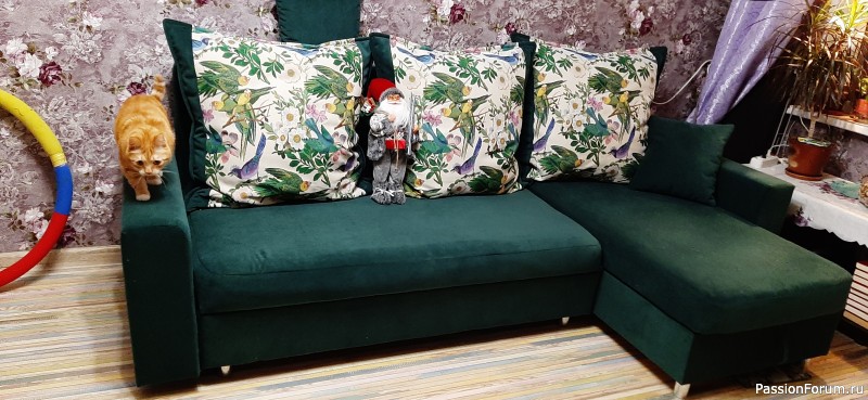 Светлана, вот это по-нашему! Диван обрел вторую жизнь. Новая обивка красивого глубокого цвета, яркие удобные подушки. У котов явно «чешутся» лапы опробовать обивку на прочность.