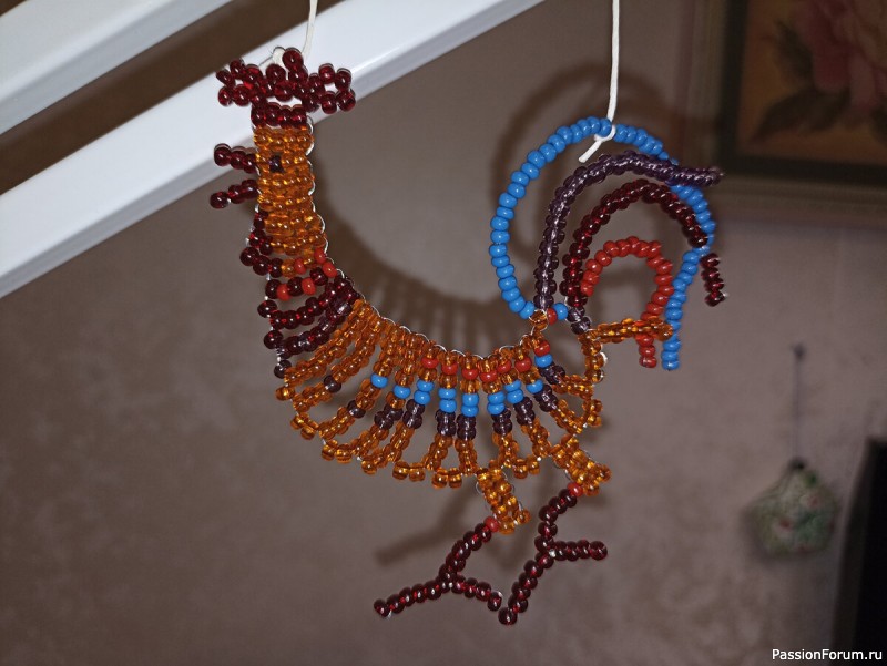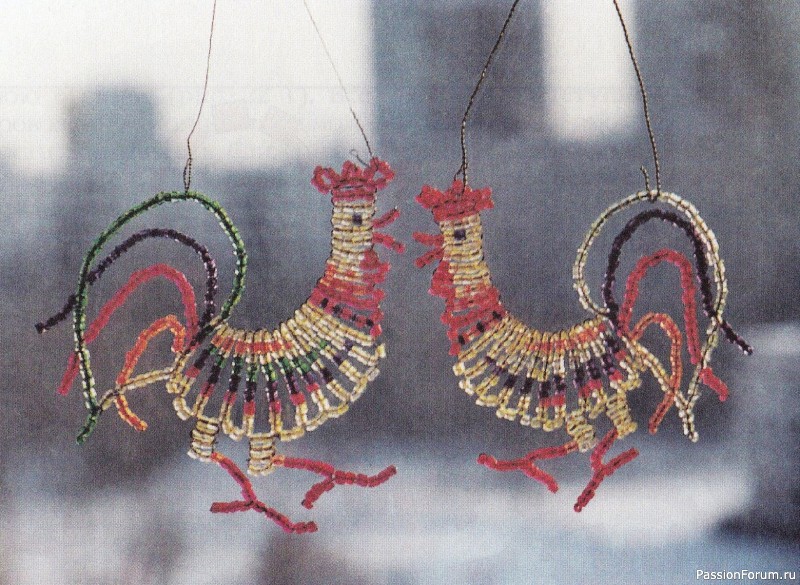 Окончив низание, придайте хвосту и лапам нужную форму. Прикрепите к гребешку и хвосту проволочную дугу, чтобы фигурку можно было повесить на окно или светильник.