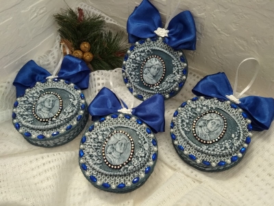 Доброго времени суток всем жителям форума! Давно не выкладывала свои работы ,вот и новый год прошёл дело к весне; а я только собралась вам новогодние игрушки показать. Всё из подручных материалов , пластиковые крышки, стаканчики от семечек и только шары из пенопластовых заготовок. В работе использовала акриловые краски, воск металлик ,акриловый лак, молды , фурнитуру , стразы, ленты для бантиков.