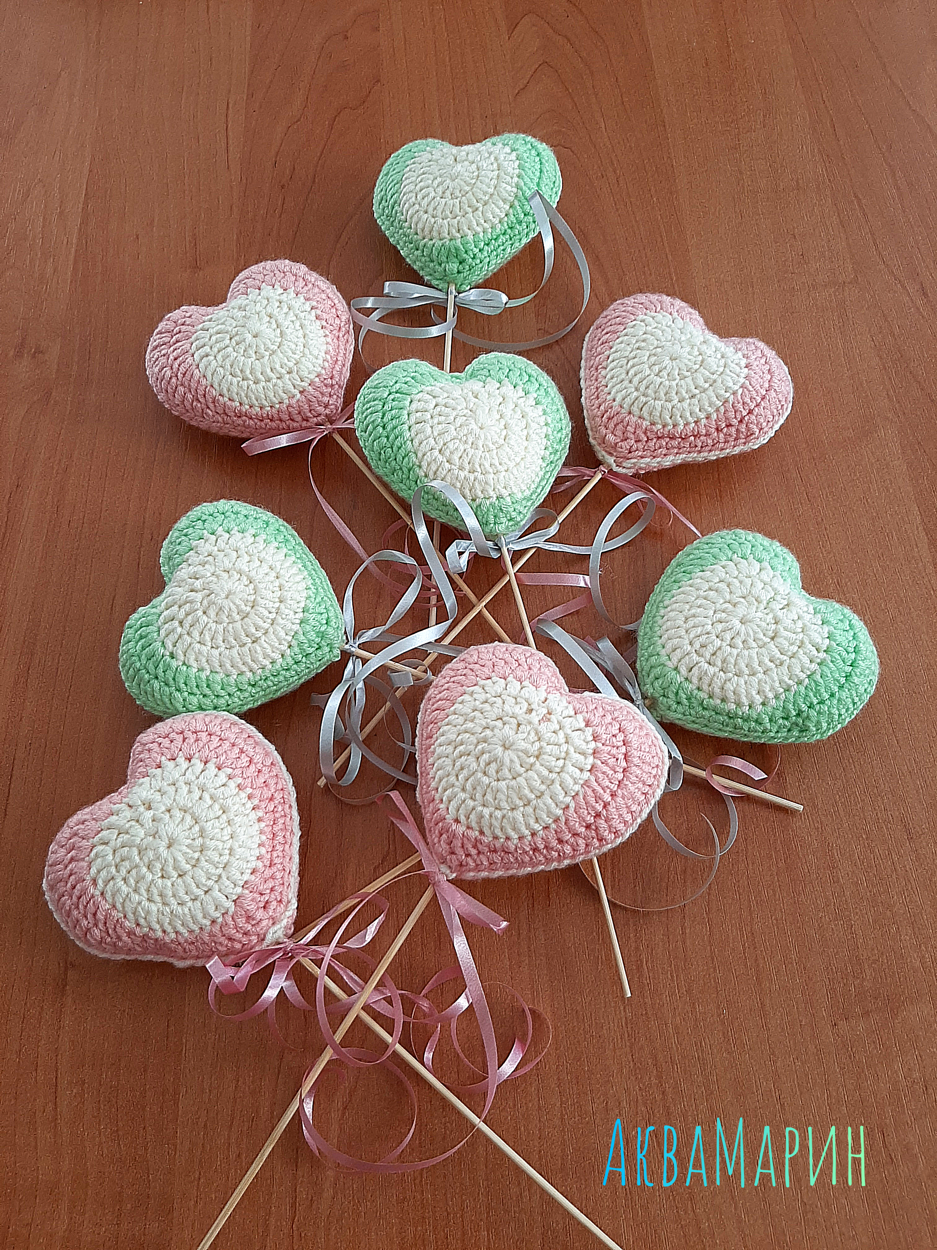 Доброго здравия, уважаемые рукодельницы! Попросили меня на работе что-нибудь связать для благотворительного аукциона акции "Доброе сердечко". Само название подсказало идею и связались вот такие сердечки. Внутри набиты синтепухом и посажены на шпажки.