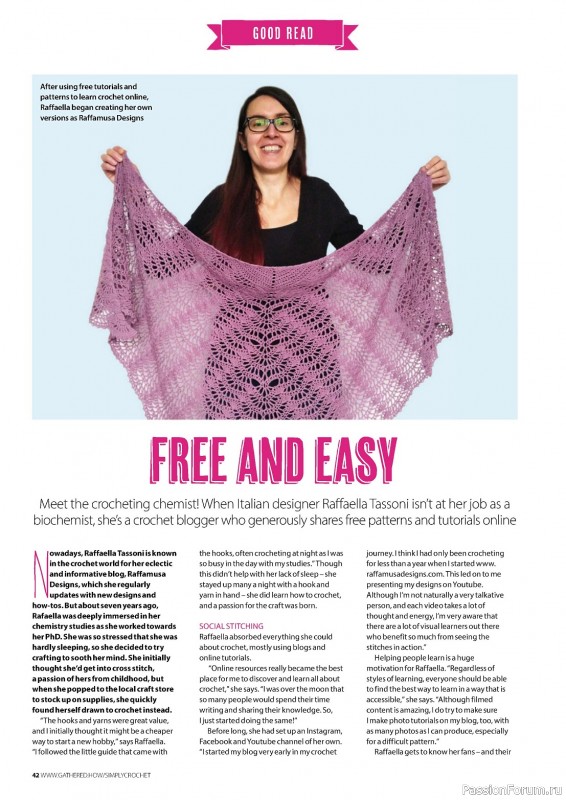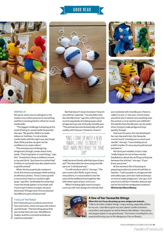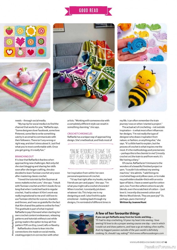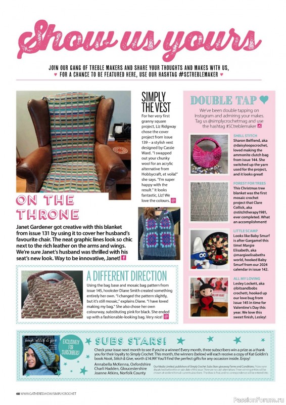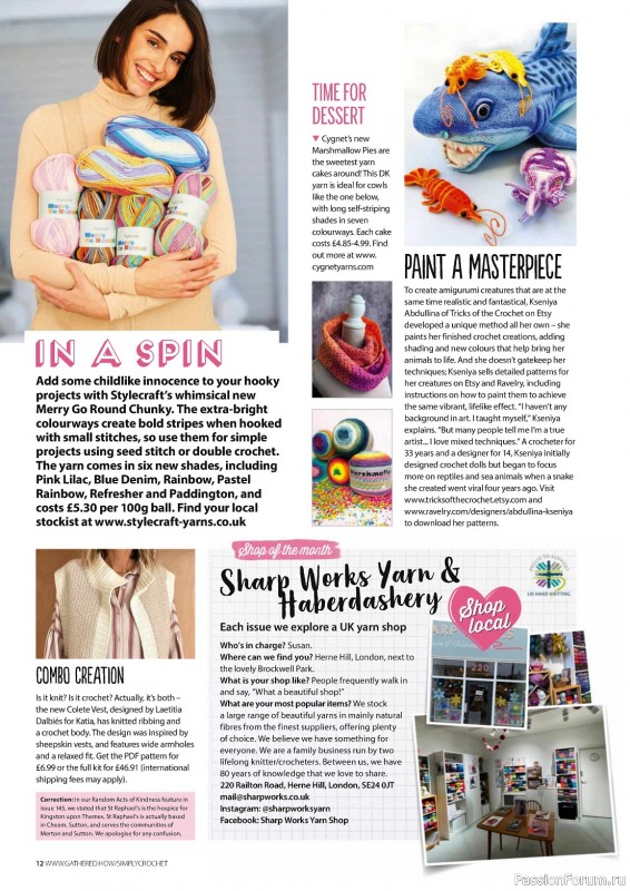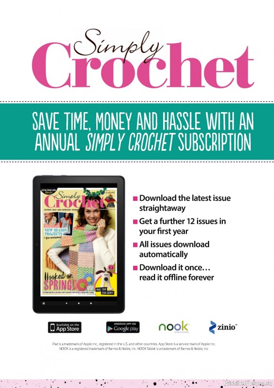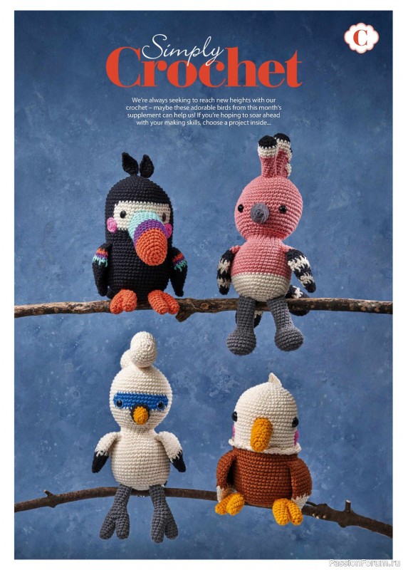 Журнал "Simply Crochet" посвящён вязанию крючком. В каждом выпуске этого журнала представлены проекты для вязания моделей одежды для взрослых и детей, аксессуаров, игрушек, предметов интерьера для дома.