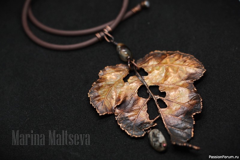 Подвеска из листа хризантемы (тоже память о подарке). Камень халькопирит.