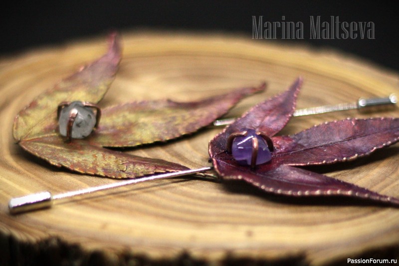 Броши из листьев дланевидного клёна. Камни аметист и халцедон.