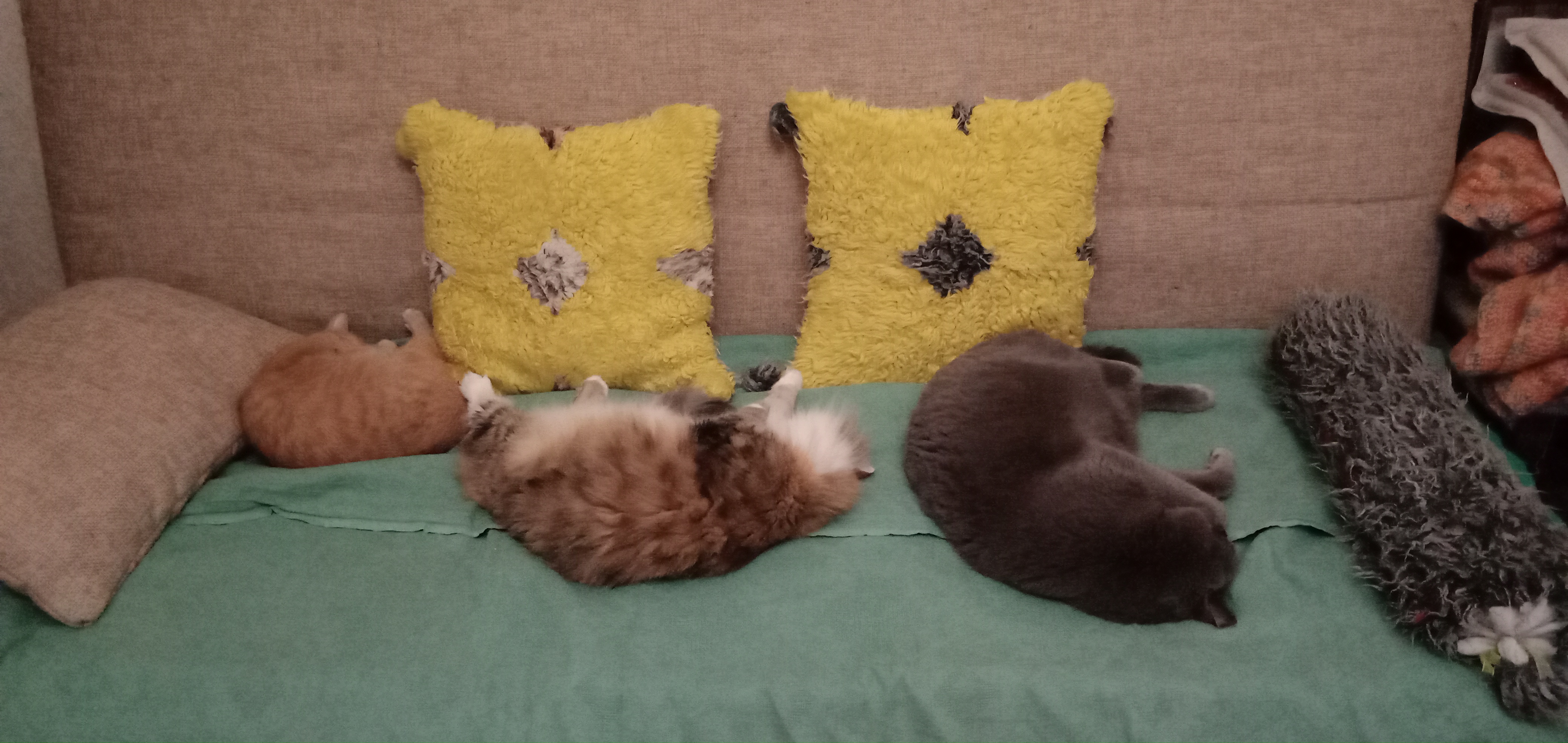 A мои 17 мордочек, даже и на фото не поместятся. Вот самые ласковые впятером лежат на кровати, возле Вики.