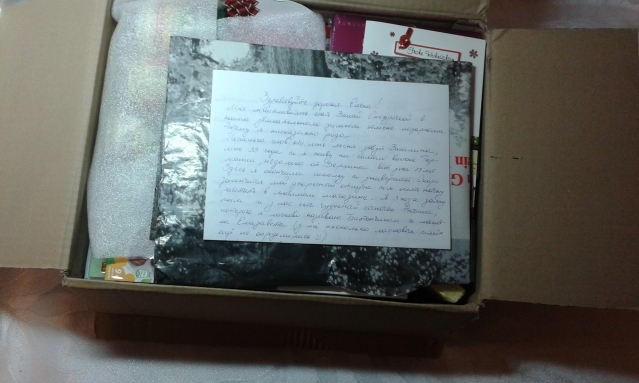 Это самая замечательная Снегурочка на свете! Извещение мне отдали в воскресенье, почему то оно попало в почтовый ящик соседям и мне его отдали через четыре дня, после того, как оно пришло. Если бы я знала, я бы уже сбегала на почту на прошлой неделе! Ну, хватит о грустном. Сегодня убежала с работы на час раньше, чтобы получить посылку, и чтобы в садик за внуками не опоздать (дочка попросила их сегодня забрать). Приехала на почту, (ура! очередь всего три человека, что для нашего почтового отделения большая удача), и вот наконец то посылочка у меня в руках! Летела домой, как на крыльях! И вот наконец то я дома! Открываю... Боже, сколько всего! Милая моя Снегурочка прислала подарки не только мне, но и моим внукам.