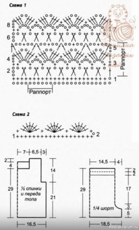 Крючком свяжите цепочку из 66 в.п. и на их основе вяжите узор по схеме 1 (= 11 раппортов). Провязав 21 ряд от начала работы, для пройм не вяжите по 1 раппорту с обеих сторон. Провязав 16 рядов от проймы, для выреза горловины не вяжите на средних 5 раппортах. Обе половинки выполните раздельно. Провязав по 4 ряда, закончите работу.