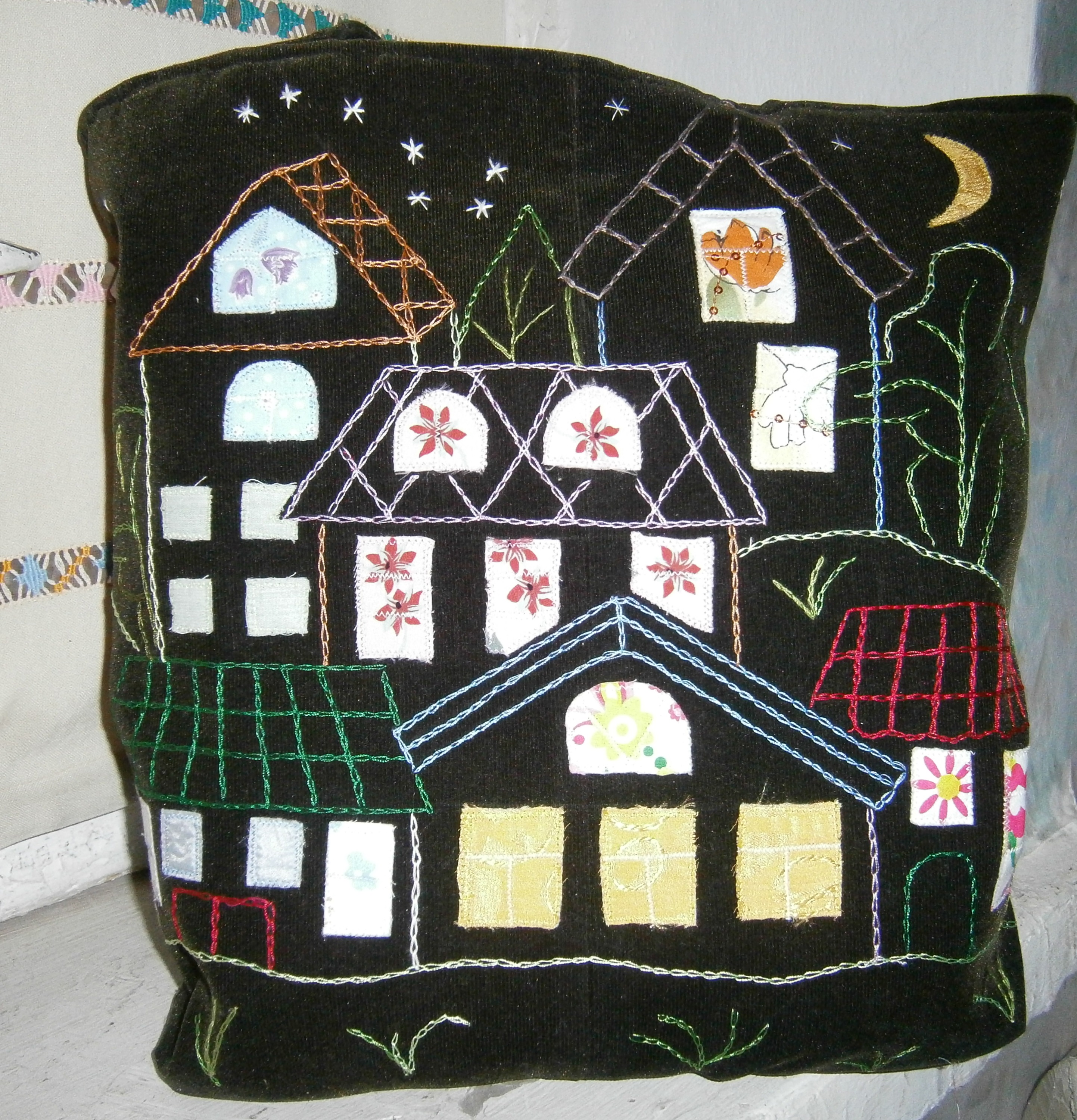 Идея с домиками из интернета. Собственная доработка и исполнение. В реальности цвета ярче, особенно окошки. Внутри подкладка и два кармана - один из них на молнии.