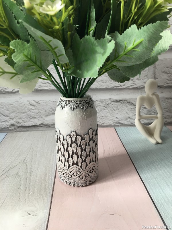 Пластиковая основа — пузырёк от капсул. Горлышко и дно обработала шпаклевкой. Далее кружево и краски акриловые. Финиш акриловый лак.