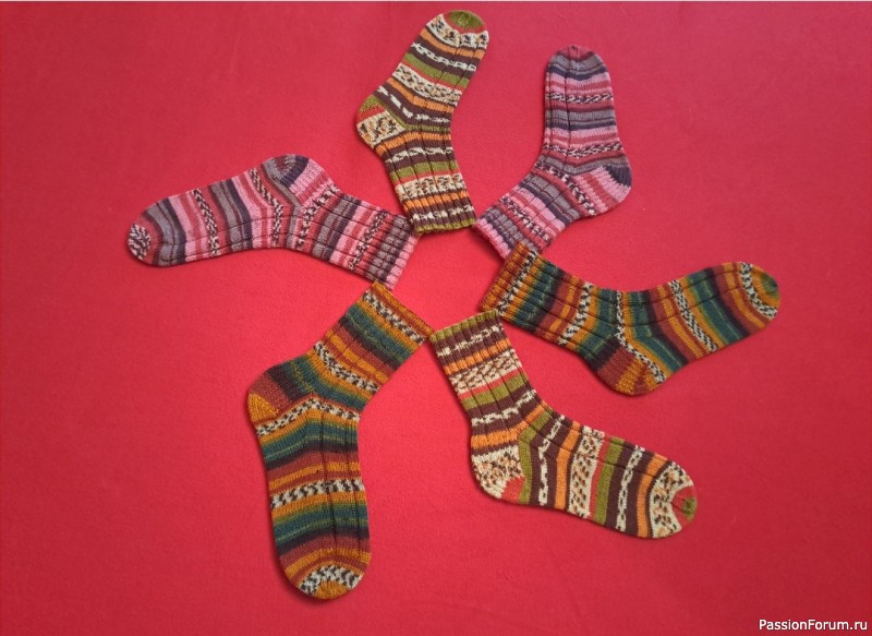 — Как тебе удалось обуздать секционную пряжу, чтобы рисунок носочка между пестрыми полосками совпал на обоих носочках до разделяющей пестрой полоски?