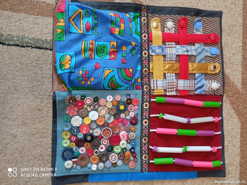 Татьяна, прелестный коврик! В своё время шила своим девочкам тоже, на нём были и шнурочки, бантики, много, поэтому в садике первые научились завязывать шнурки, всем помогали, кто нуждался, а не умел.