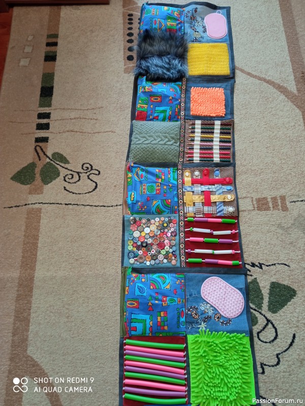 Здравствуйте, дорогие жители форума!!! Исполнилось два года моей внучке Полине. Сшила ей коврик ( идея из интернета, много смотрела разных авторов коврики), по которому можно ходить, прыгать, ползать, щупать, пытаться оторвать (пуговицы пришивала 2 дня!), короче, развлекаться иногда. Хранится в сложенном виде, когда Полина хочет бегать по нему, то тащит из уголка и коврик раскладывают.