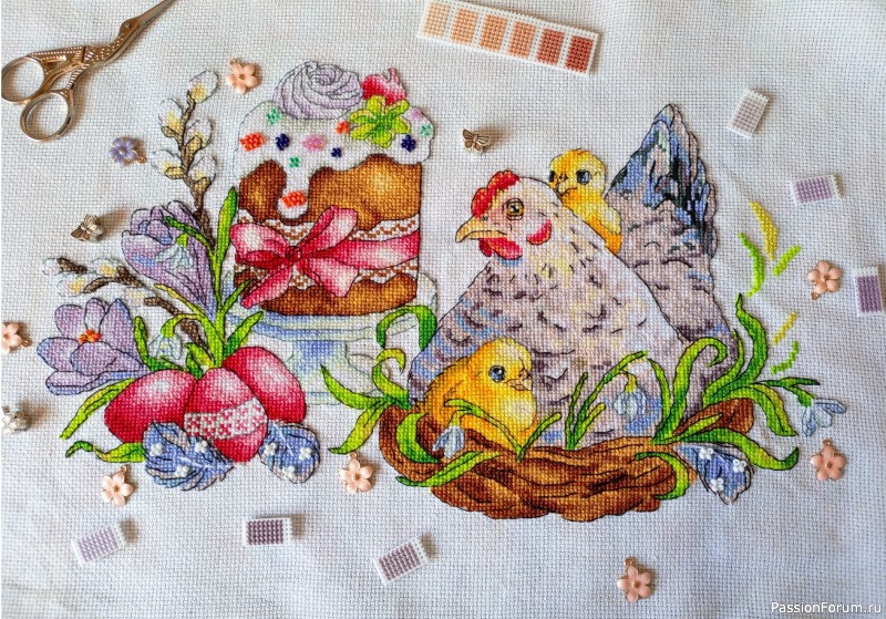 Очень мне хотелось вышить, что то к празднику Пасхи. И по иллюстрации Ольги Манжосовой, была разработана схема. Вышивала нитками СХС, конечно, некоторые оттенки отличаются от ДМС, но не критично. Бисер брала, тоже не по ключу, какой был под рукой))) И к сожалению, камера не передает цвета как они есть, в живую получилось ярче.
