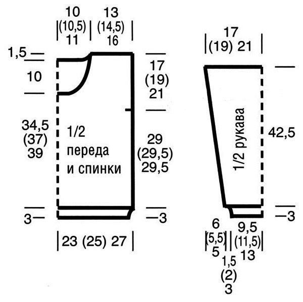 Перед: вязать как спинку, но с более глубоким вырезом горловины. Для этого через 34,5 см = 90 р. (37 см = 96 р.) 39 см = 102 р. от планки закрыть средние 26 (28) 30 п. и обе стороны закончить раздельно, затем для закругления закрыть с внутреннего края в каждом 2-м р. 1 х 3 п., 2 х 2 п. и 2 х 1 п.
