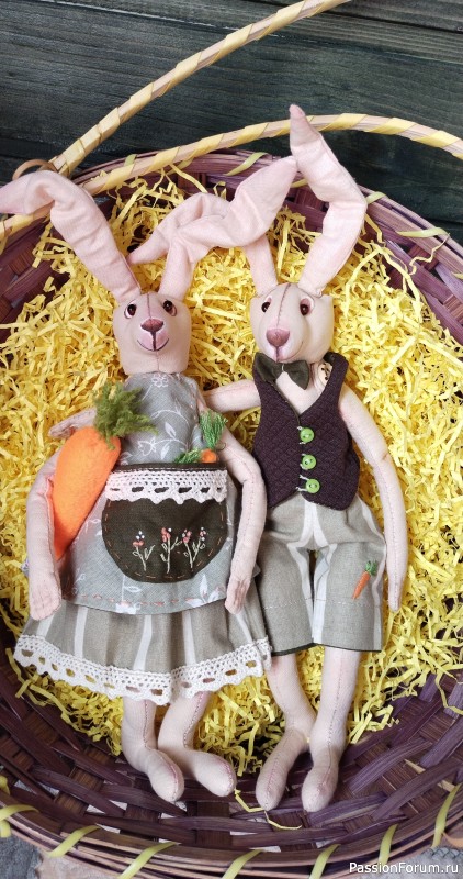 Чтобы зайцу было не грустно,сшила ему подружку.Рост 27-28см.На кармашке ручная вышивка в кармашке запасы морковки,чтоб не голодно было.))