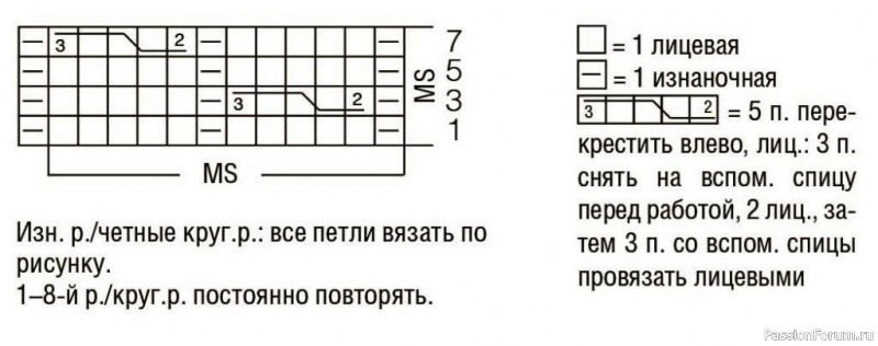 Вязать согласно схеме. На ней даны лицевые/ нечетные круговые ряды, в изнаночных/ четных круговых рядах все петли вязать по рисунку.