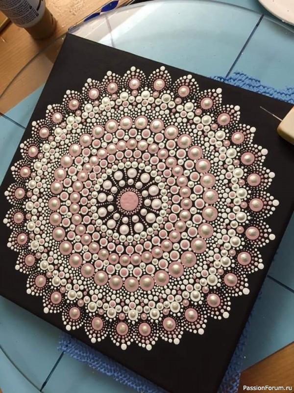 Здравствуйте дорогие рукодельницы. Хочется добавить красоты в ленту новостей, я создала ещё одну небольшую картину в технике точечной росписи и спешу показать её) Использовала всего два цвета - белый и голубой, чередуя их в рядах, в конце расставила точки перламутром цвета слоновой кости. Такая роспись очень приятная тактильно, прямо настоящий антистресс) Последнее фото - образец из интернета, с которого я срисовывала, немного изменяя