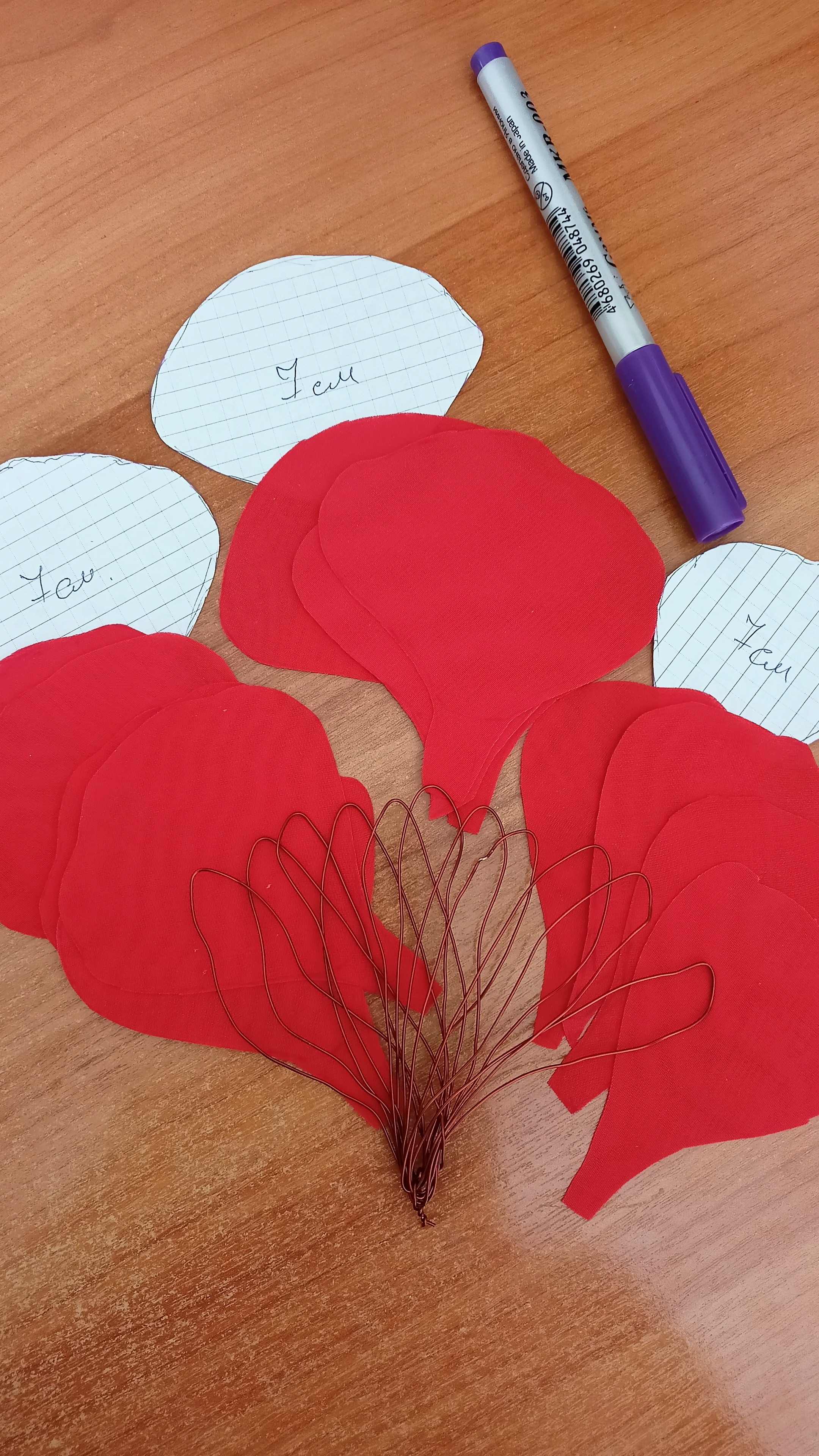 3. Делаем лепестки мака. Находим шаблон лепестков мака (я делала шаблоны обводя лепестки настоящего мака). Переводим выкройки на картон. Вырезаем лепестки из шифона с помощью ножниц. Чтобы шифон был плотнее, я сложила его вдвое, а внутри проложила широкой клеевой лентой и прогладила утюгом. Края обрабатываем с помощью зажигалки.
