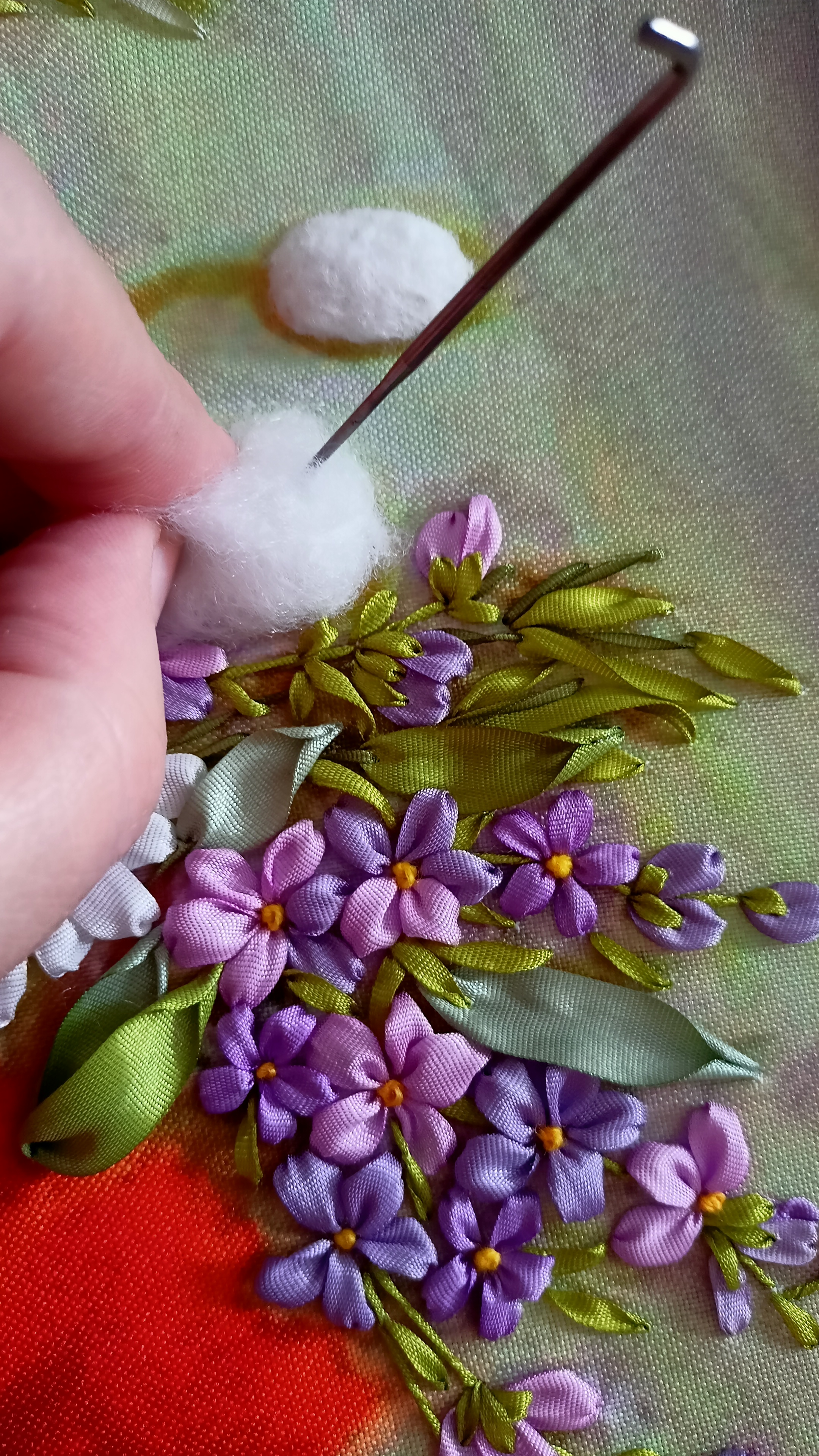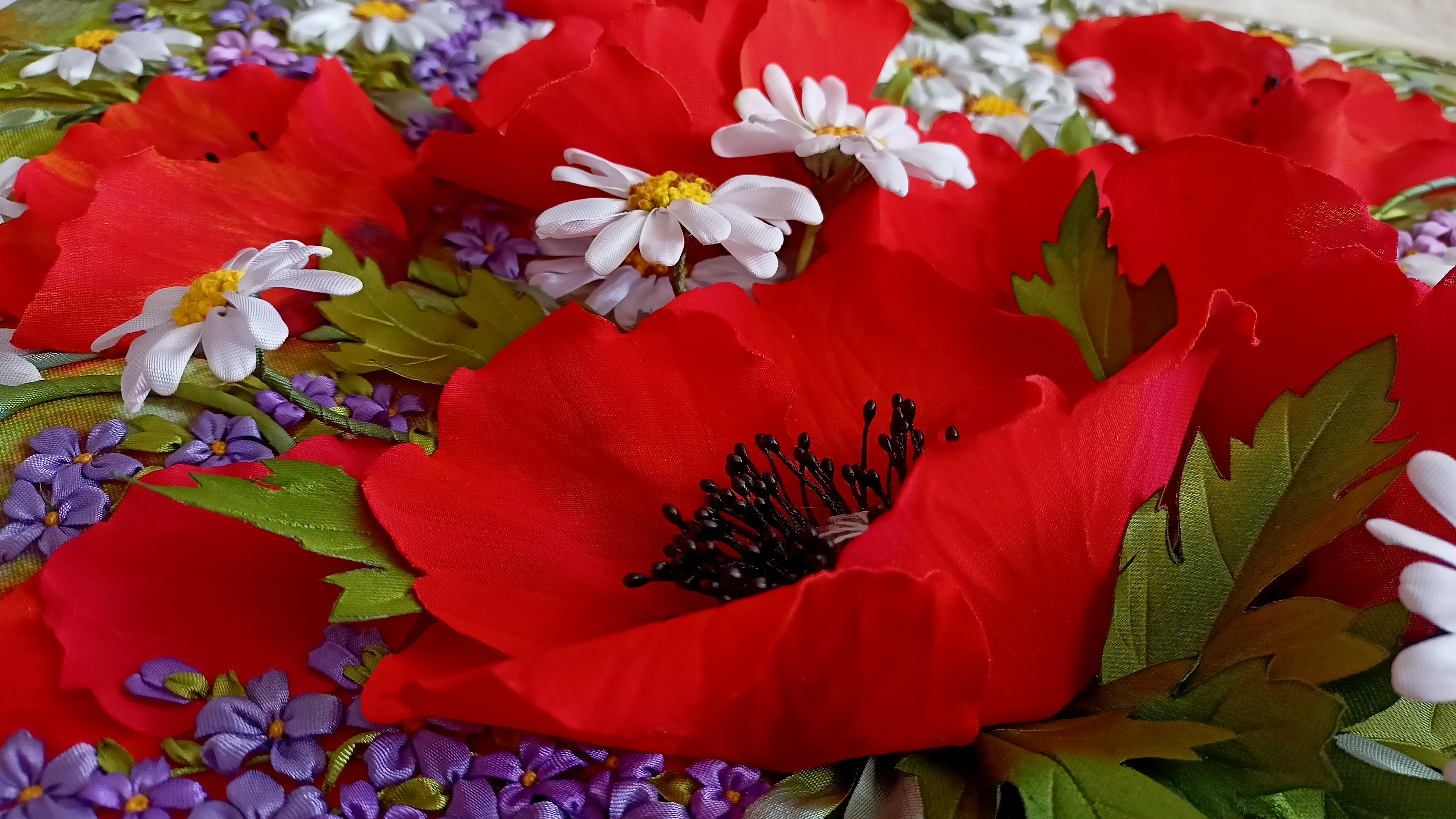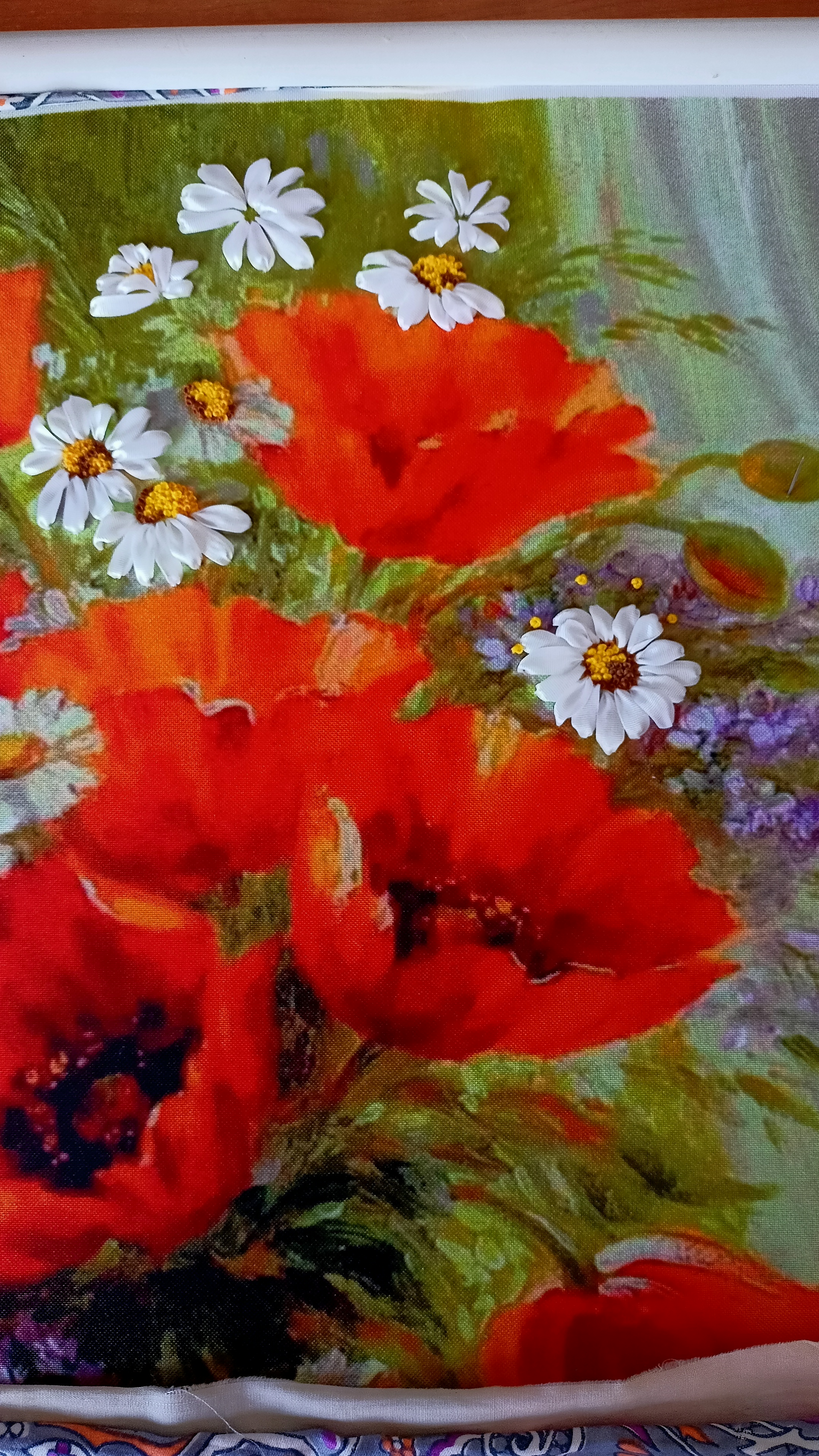 А вообще сначала я все картины вышиваю в своей голове. Какие приходят сразу, а какие вынашиваются годами. Путь к вышивке этой работы был не быстрым. Покупались материалы, затем возникали новые идеи, покупались другие материалы. Была перелопачена куча видео на Ютубе о том, как делаются маки. А до этого, в самом начале творческого пути, было посещено множество МК по вышивке лентами. Наконец все срослось! Картина делалась месяца два, с учетом моей работы 2/2, домашними неотложными делами и временами возникающей аппатии ко всем творческим и нетворческим процессам после перенесенного Ковида. Если откинуть все эти факторы, то две недели вполне реальный срок!)