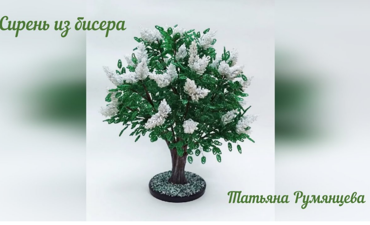 Высота куста - 38 см., ширина - 35 см. Материал: бисер белого и зеленого оттенков; проволока 0,4 мм. коричневого и стального цвета; проволока 0,9 и 1,5 мм. (1,5 лучше заменить 2,0 мм.); нитки коричневого цвета; флористическая лента коричневого цвета; гипсовый бинт; алебастр; сухая финишная шпатлевка; вода; строительный клей ПВА; акриловые краски; кисточки; сухая бумажная салфетка.