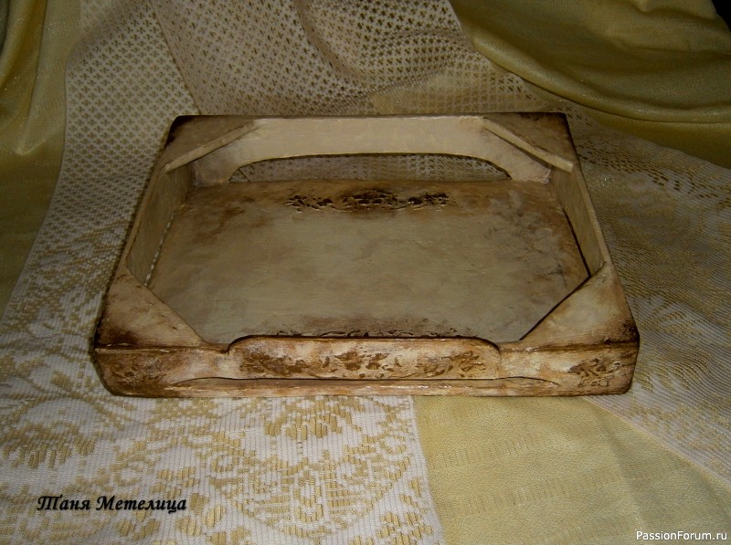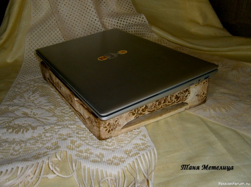 Здравствуйте, дорогие феечки! Сделала еще подставку для другой дочери. Запрос был таким, чтобы можно было ставить компьютер на колени. Поэтому сама подставка опирается на дно, чтобы ни колени, ни одеяло не мешали хорошей вентиляции. Все сделано из гофрокартона. Собрана конструкция, оклеена бумагой, зашпатлевана вся поверхность, ошкуривание, нанесение трафаретного рисунка шпатлевкой, окрашивание и покрытие лаком. Единственный нюанс, каждую просушку после очередного этапа проводила под грузом, картон норовил изогнуться то в одну сторону, то в другую))) Вот что получилось.