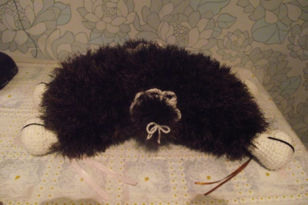 У хвостика обвязала белой пряжей крючком что-то вроде цветка (я ведь «чайник» в вязании крючком и что как называется ещё толком не знаю), потому что хвостика не видно на коричневом, сливается. Пришила, а сверху хвостик пришила, на хвостике завязала бантик из белой пряжи, опять же чтобы выделить хвостик.