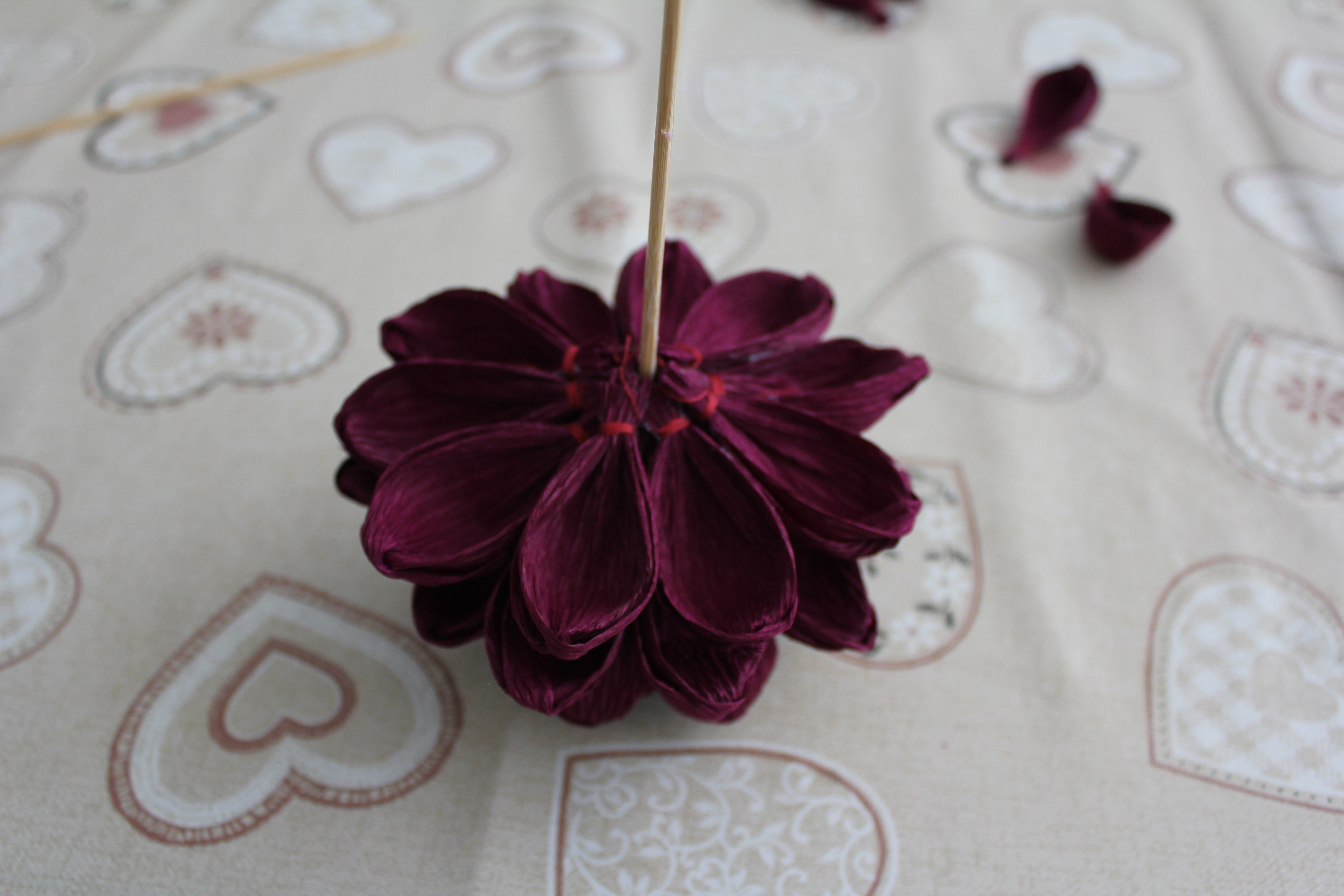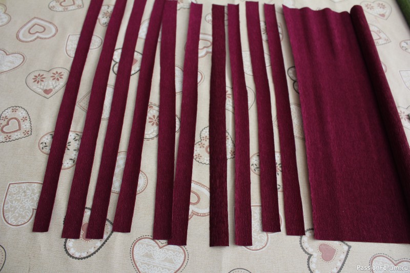 Сделать такой цветок можно из твердой гофрированной бумаги любого цвета. Для работы нам понадобится ножницы, клей ПВА и горячий клей, нитки, палочки для гриля или проволоки и желание творить.