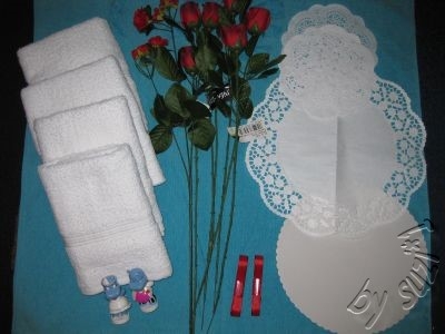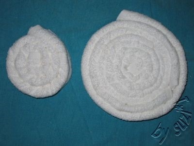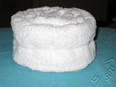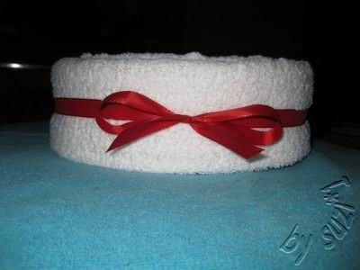 Для первого «слоя» торта из полотенец понадобиться 3 полотенца. Для второго — одно.