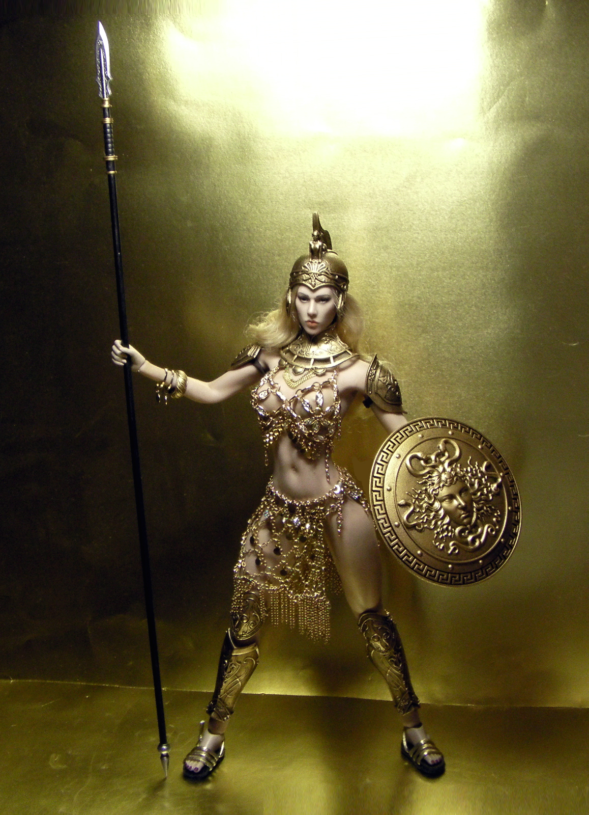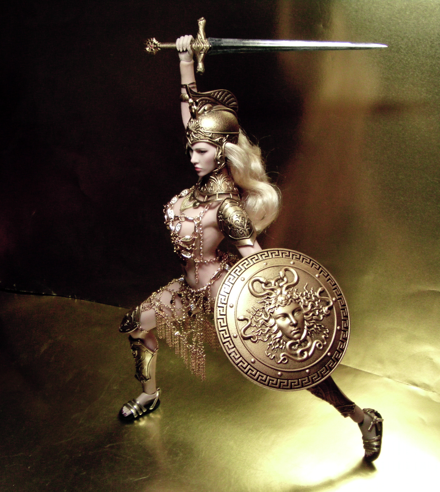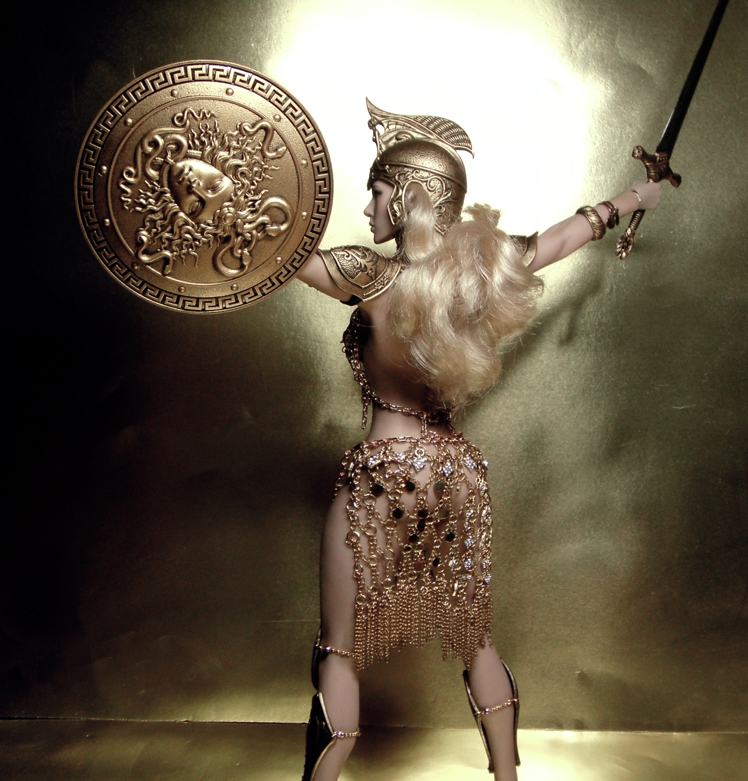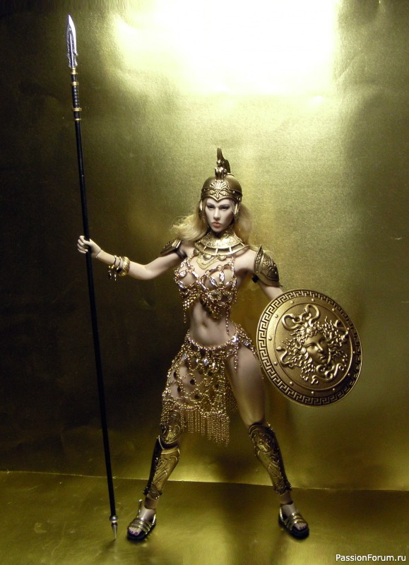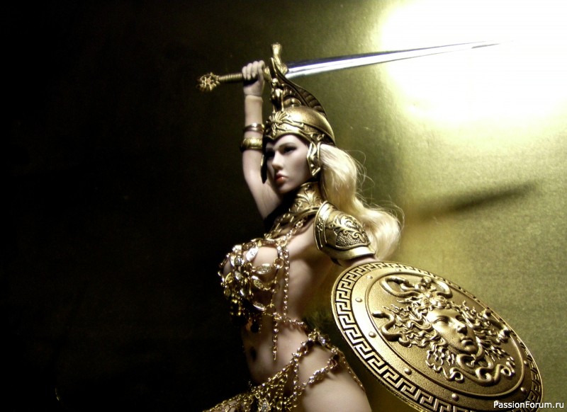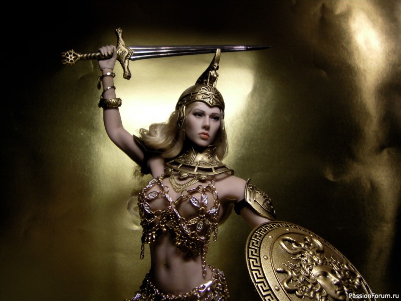Хасан, какая прелесть! Прекрасная блондинка-воительница. Оружие и доспехи ваших рук дело? Какой длины меч и диаметр щита? Размер обуви я уже знаю. Щит удивительно красив, греческий орнамент по окружности и объемный портрет Горгоны ( если не ошибаюсь ) в центре безусловно в тему. Шлем, наплечники и поножи, какая тонкая работа! Представляю, как переливается одежда спартанки. Всё очень гармонично, в том числе и выражение лица спартанки, и шлем ей очень к лицу.