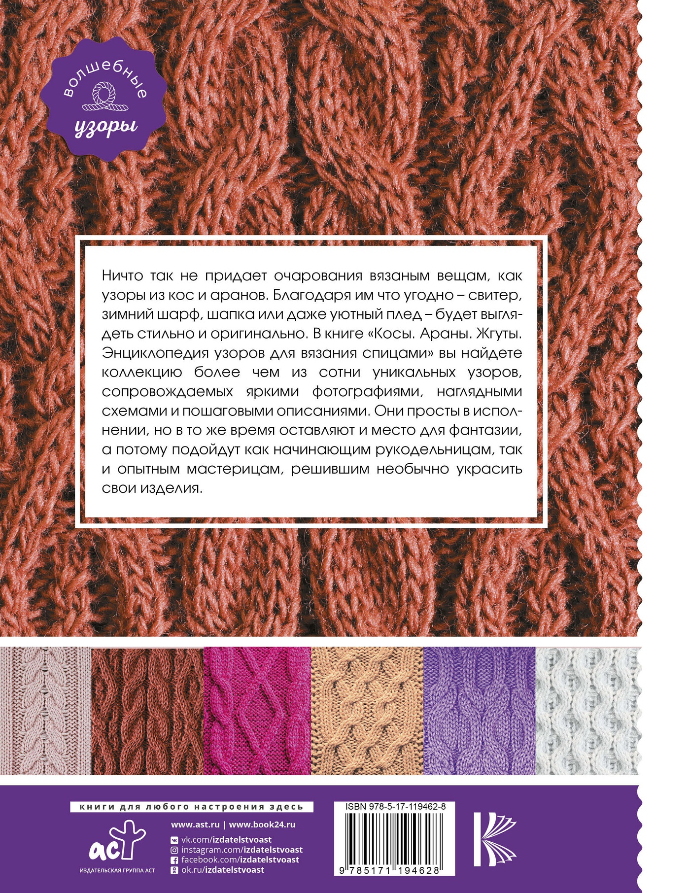 В книге «Энциклопедия узоров для вязания спицами» вы найдете коллекцию более чем из сотни уникальных узоров, сопровождаемых яркими фотографиями, наглядными схемами и пошаговыми описаниями.