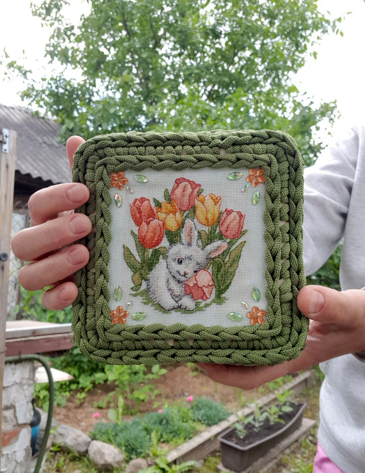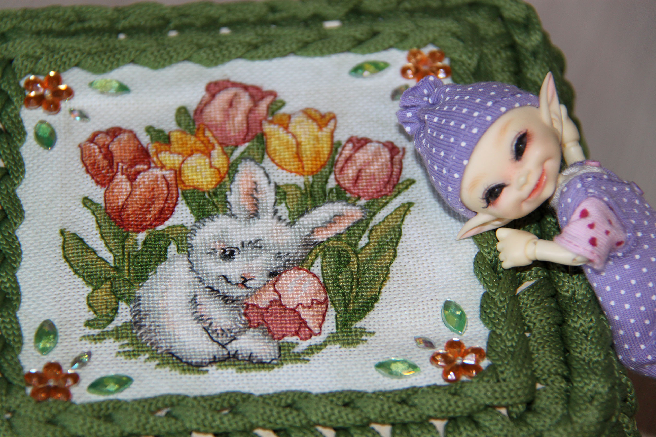 Малахитовая шкатулка "Кролик в тюльпанах"