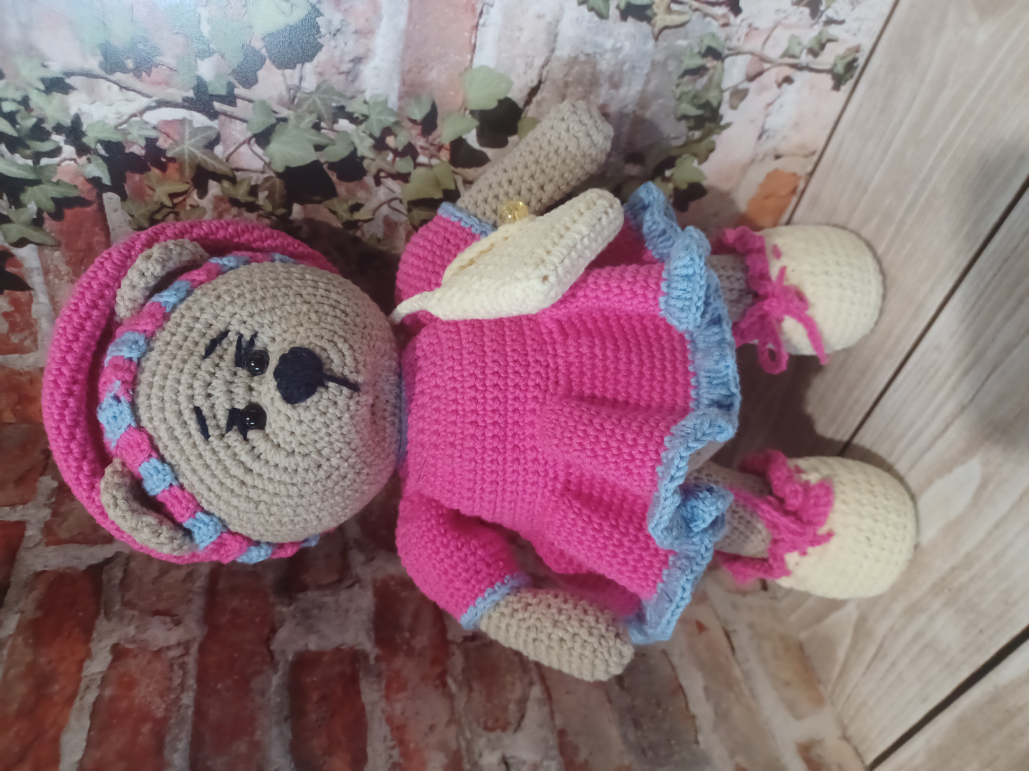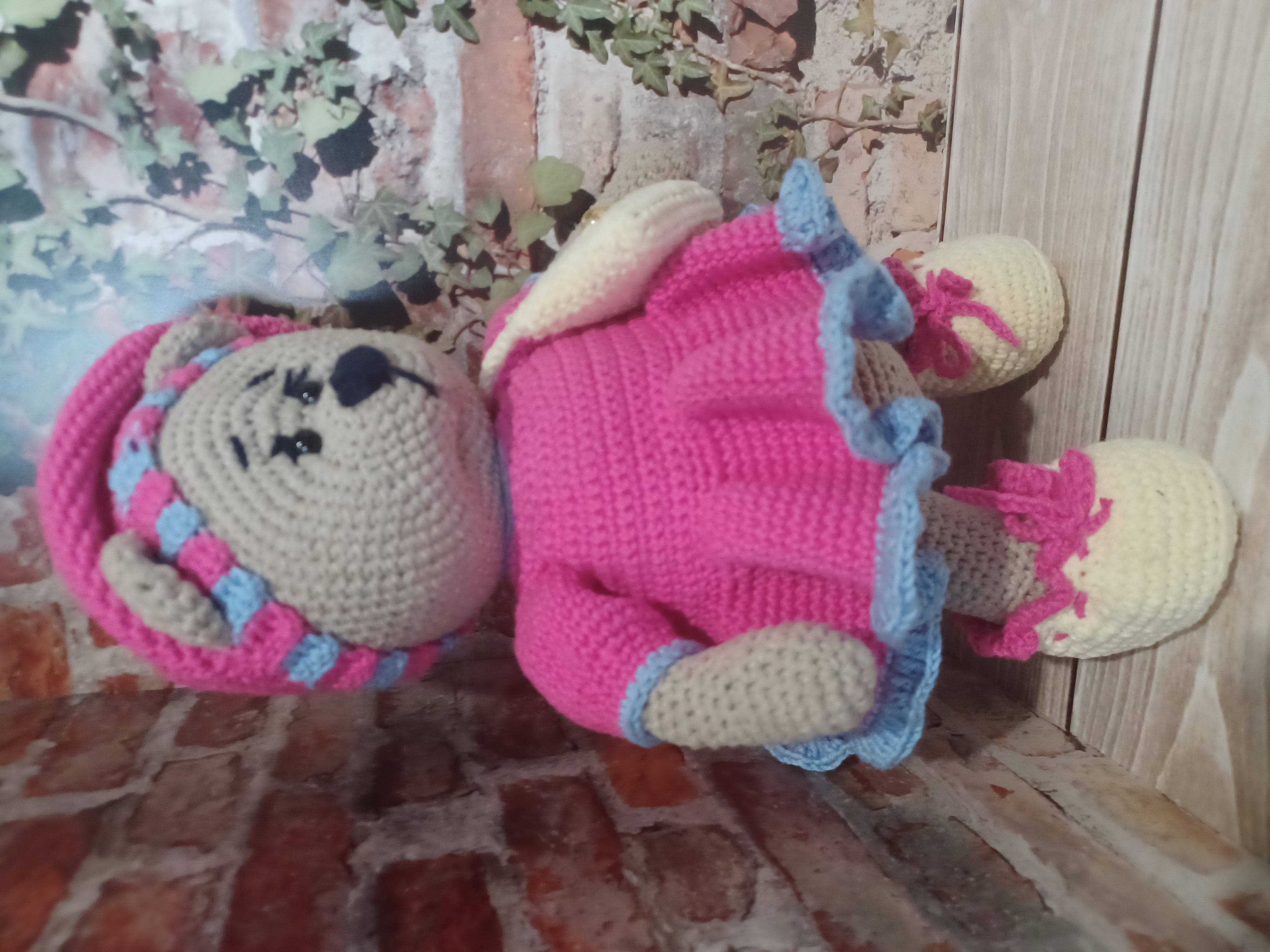 Мишутка Маня — это очаровательная вязаная игрушка, которая станет прекрасным другом для вашего ребёнка. Мишутка имеет рост 25 см и всю одежду, которую можно снимать.