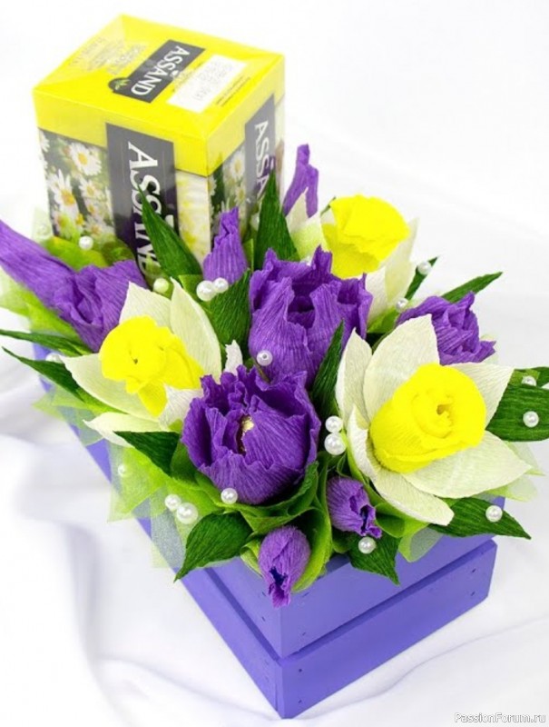 Материалы: • Коробка чая Assand; • Ящик для цветов, сиреневый; • Пенопласт; • Конфеты "Осенний вальс"; • Гофрированная бумага, производитель Италия, плотность 180гр, № 17Е\2 сиреневого цвета, №560 Зеленого цвета; • Нарциссы из конфет 3 шт, делаем по мастер-классу: • DIY Нарциссы из конфет. Цветы из гофр... • Органза зеленого цвета; • Бусины; • Проволока; • Термо клей.