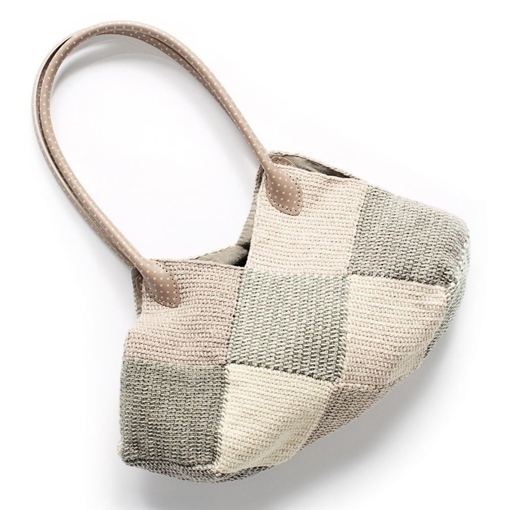 Сумка выполнена из квадратов, каждый из которых связан в технике тунисского вязания двумя цветами. Квадраты собираются по принципу «берестяной корзинки». Переходить на нить другого цвета перед каждым обратным рядом.
