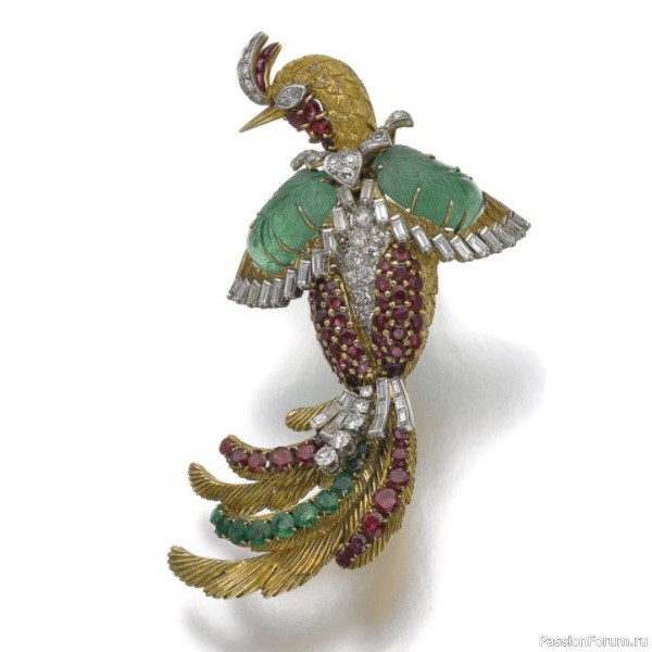 Брошь из золота с изумрудами, рубинами и бриллиантами, Mauboussin, около 1960 г.