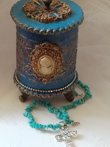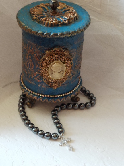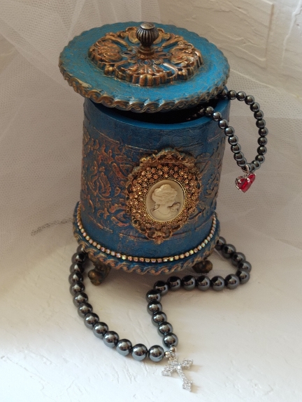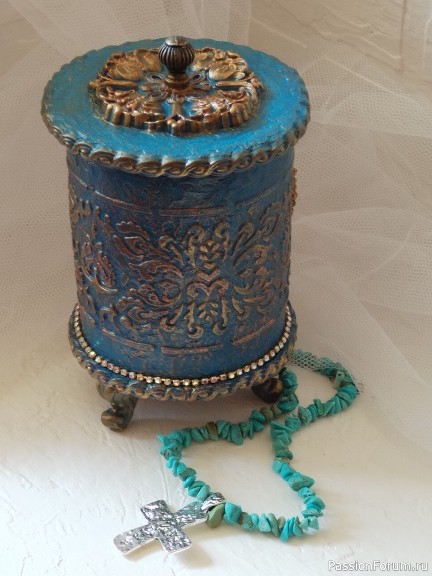 Работ накопилось много, хотелось поделится, а времени выставить не было. То одно, то другое отвлекало, но всё таки свершилось. Шкатулка сделана из бобин от скотча, шпаклёвка, молды, трафарет, акриловые краски, воск металлик, акриловый матовый лак, фурнитура.