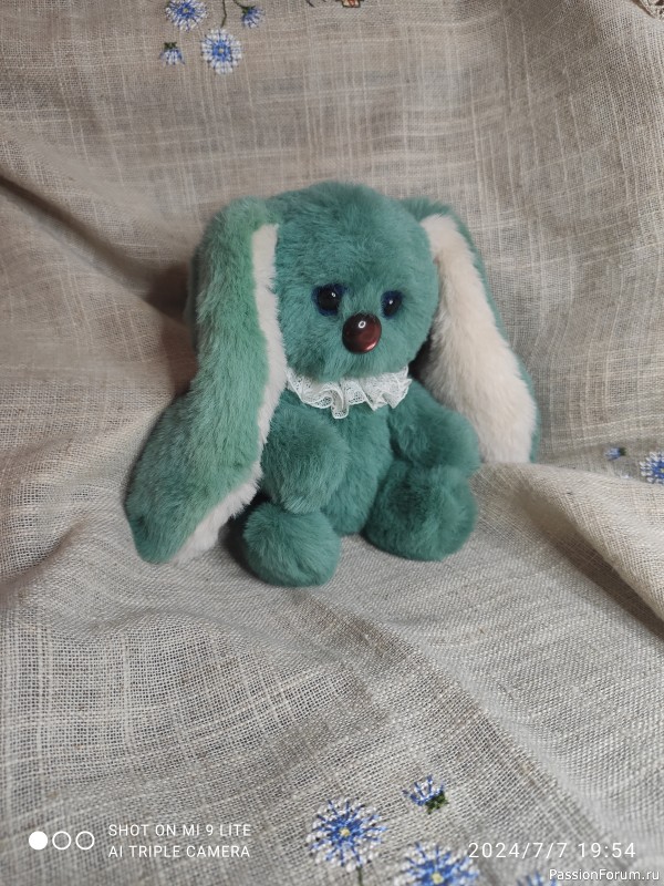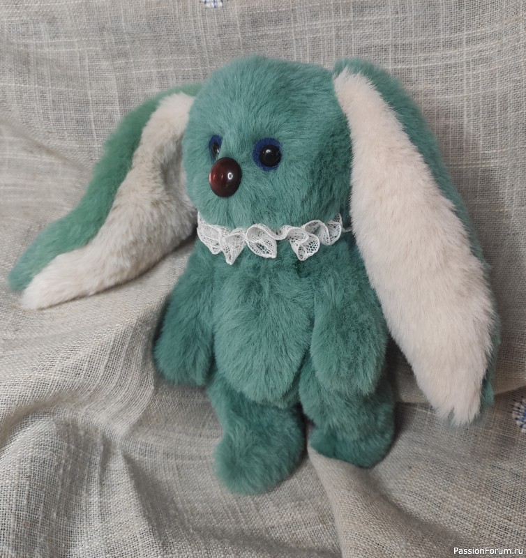 Мятный зайка Сенечка по выкройке Ольги Нечаевой. Вместо носа красивая пуговка, ручки - ножки подвижные. Выкройка понравилась - точная и не очень сложная.