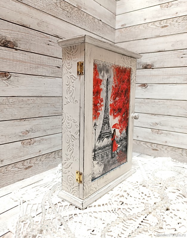 Заготовку покрыла узорами из шпатлевки, внутреннюю часть - морилкой, наклеила мотив на дверцу, всё окрасила белым акрилом, обязательная часть - покрытие лаком, просушка. И в завершение - полусухой кистью мазки по всем рельефным и выступающим частям ключницы.