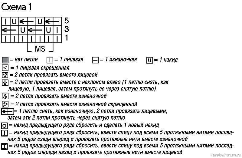 Число петель кратно 3 + 1 + 2 кромочные = вязать согл. схеме 1. На ней даны лицевые ряды. В изнаночных рядах петли и накиды провязывать изнаночными. Начать с 1 кромочной и петли перед раппортом, раппорт постоянно повторять, закончить петлями после раппорта и 1 кромочной. Выполнить 1 раз 1—6-й ряды, затем постоянно повторять 3—6-й ряды.