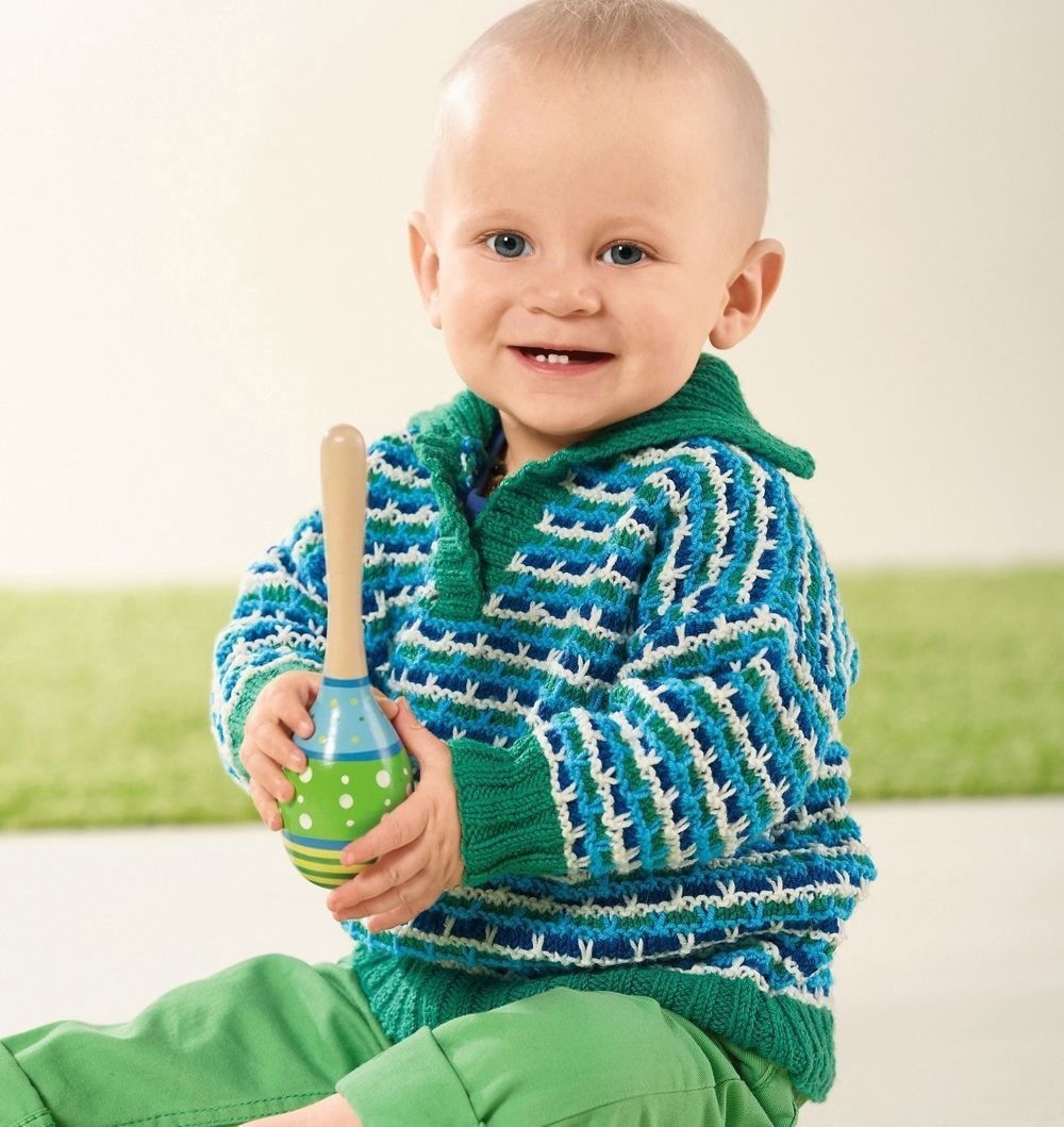 Четырехцветный узор со снятыми петлями в этом пуловере эффектно подчеркнут однотонными воротником и планками.
