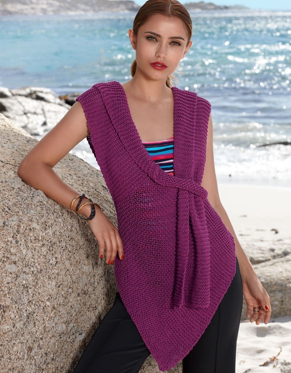 Пряжа (50% хлопка, 50% полиэстера; 90 м/ 50 г) — 400 (400–450–500) г цвета фуксии; спицы №8.