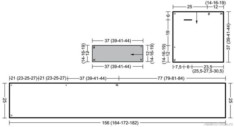 Шарф по левому боковому краю пришить к переду и спинке (см. метки совмещения, от v до #) = в результате образуется отверстие для руки.