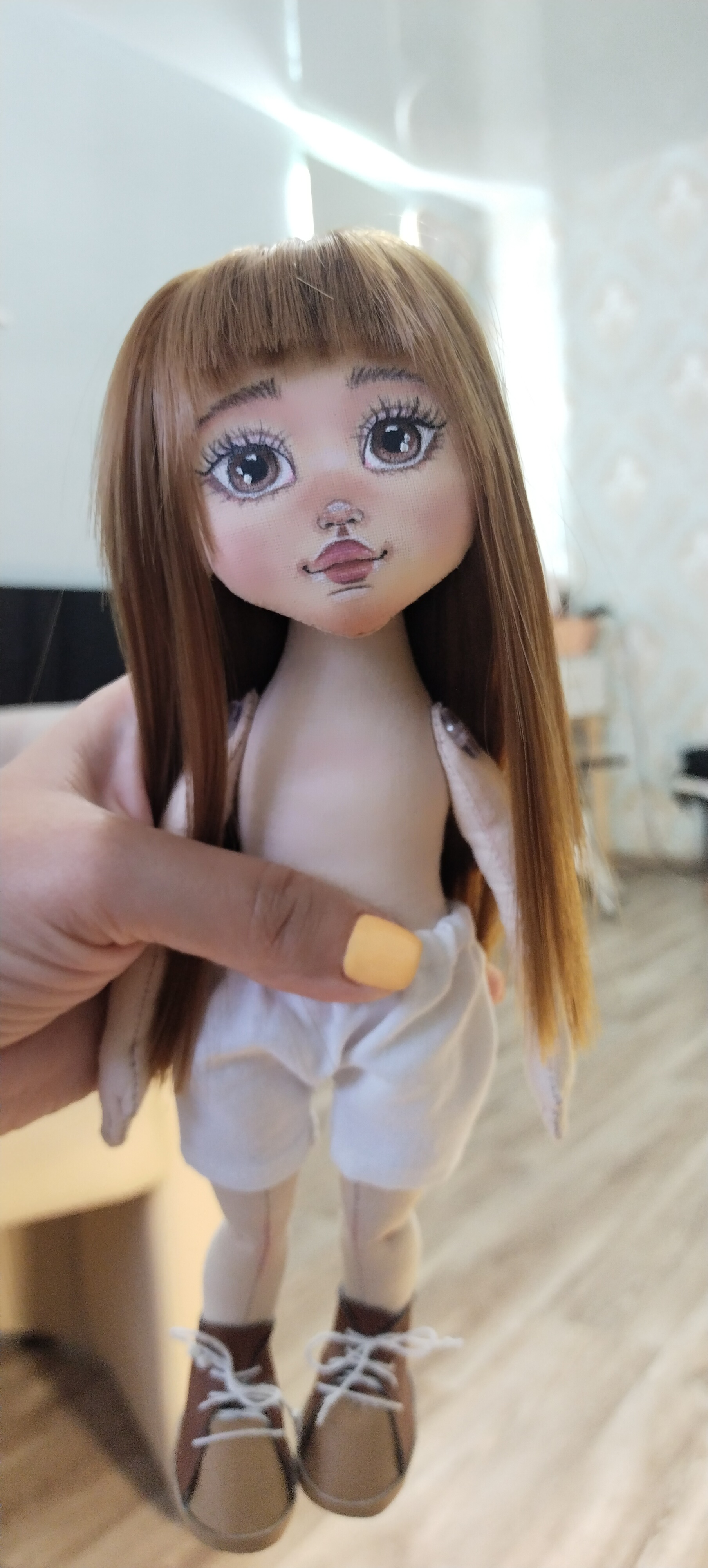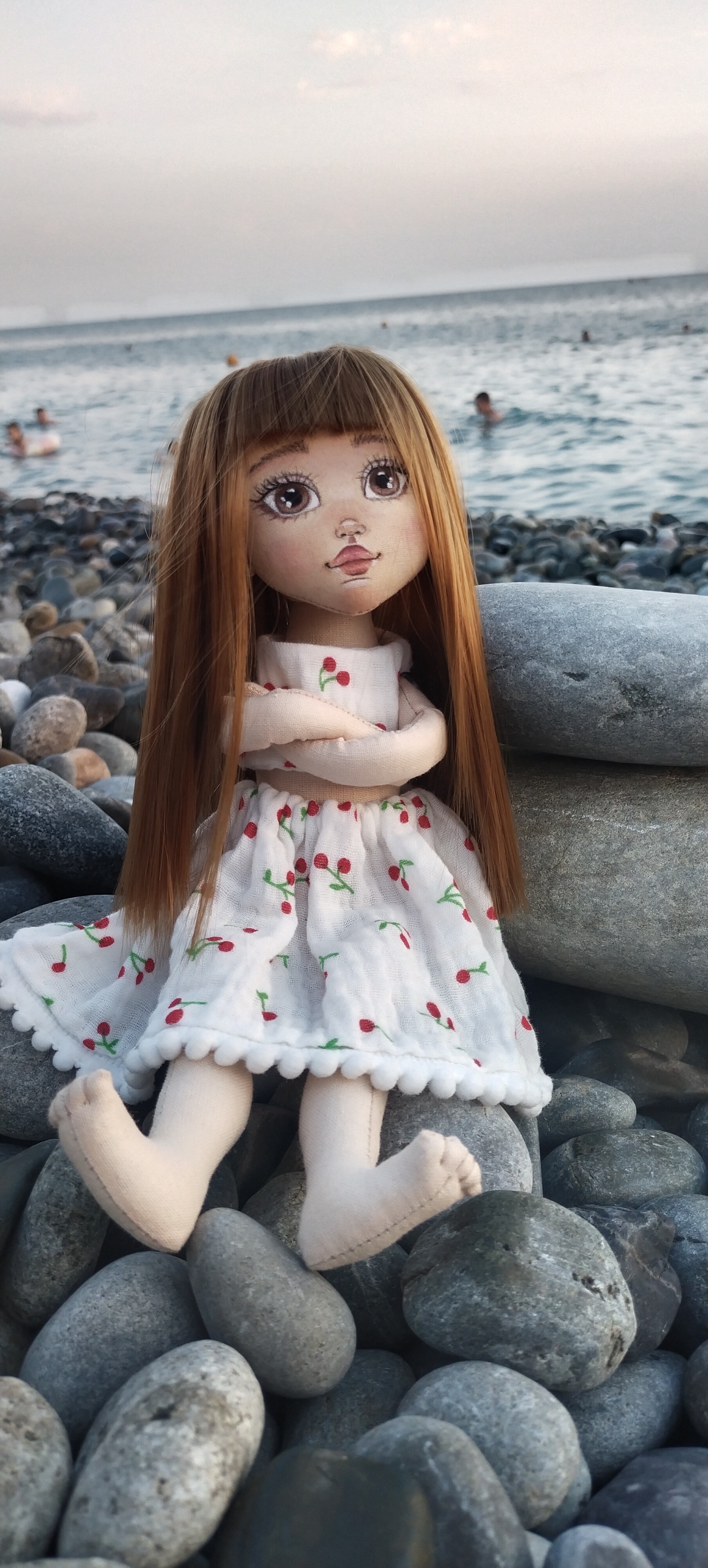 Эта куколка путешественница.Она ездила со мной на море. Летний наряд дошивала ей прямо в поезде.Ручки ножки и голова подвижные.Люблю её.